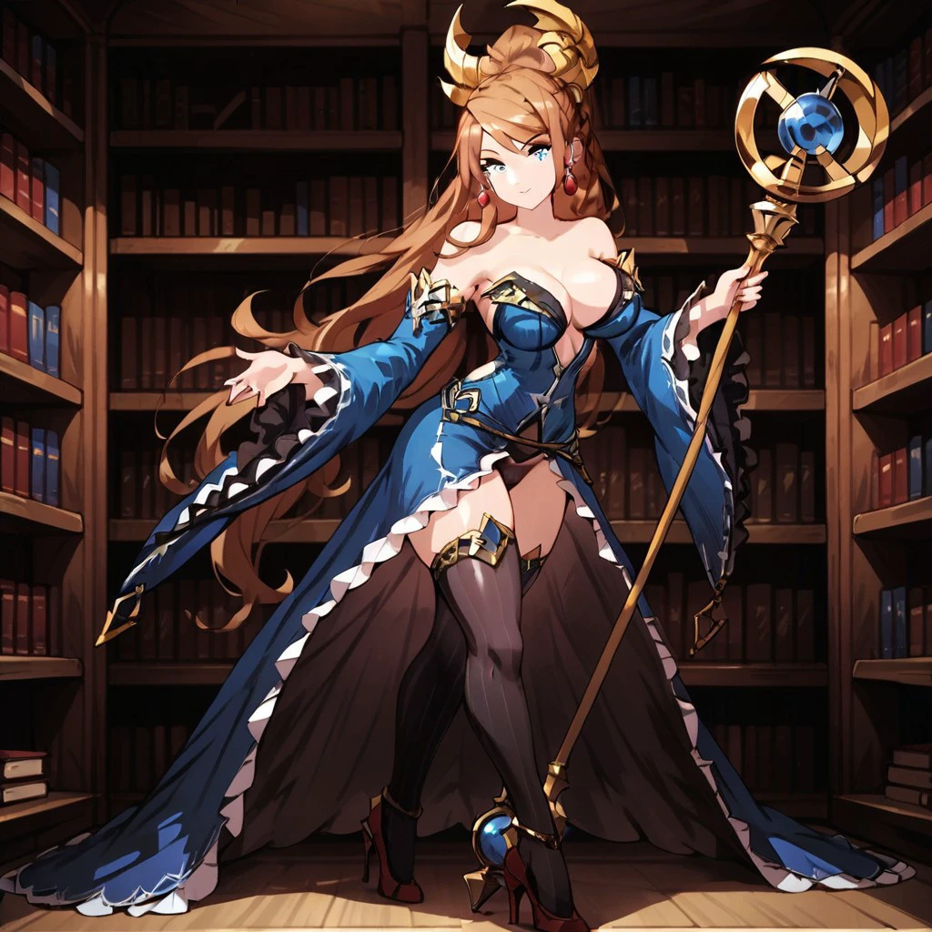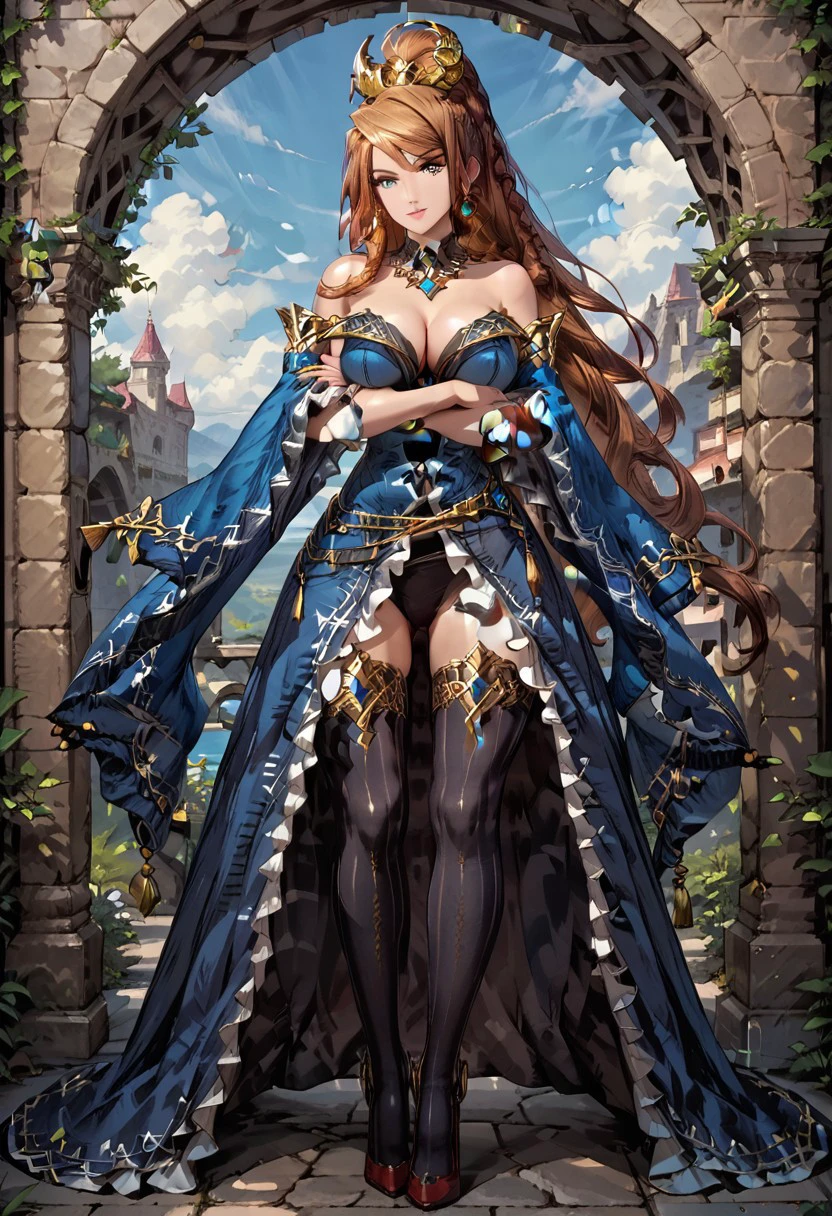 mediena, 1girl, breasts, solo, long hair, thighhighs, large breasts, cleavage, high heels, braid, dress, wide sleeves, detached sleeves, bare shoulders, earrings, jewelry, black thighhighs, blue dress, very long hair, full body, blue eyes, brown hair, frills