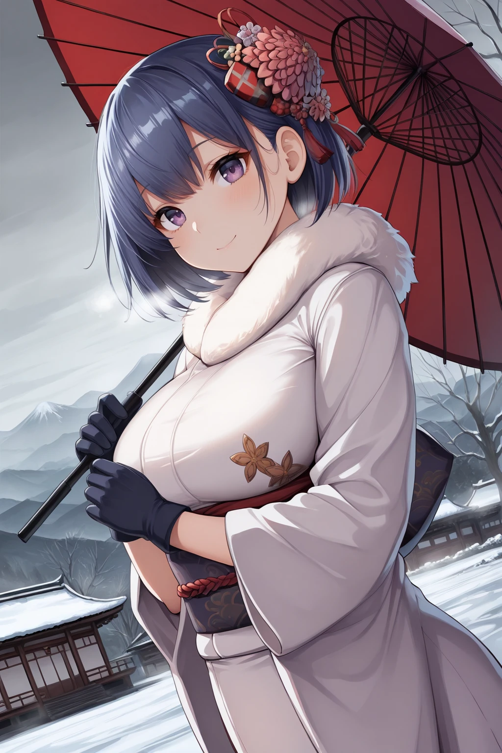 Appearance : blkhln, large breasts, purple eyes, short hair, blue hair, hair ornament, hair flower