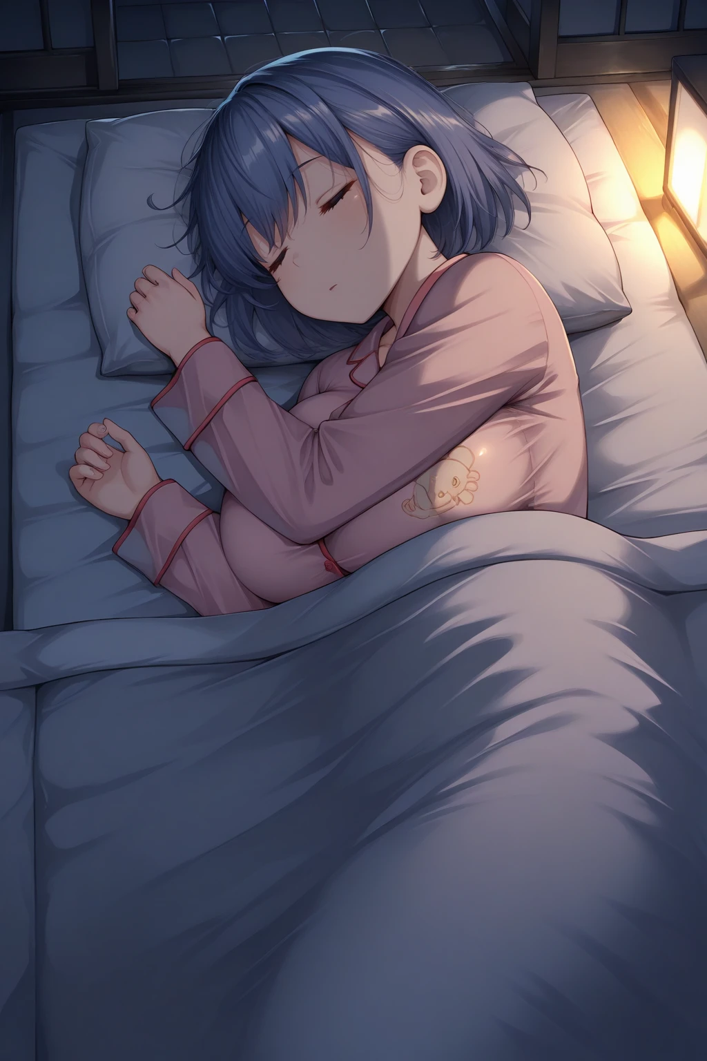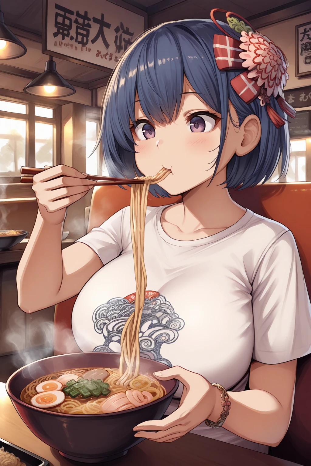 blkhln, large breasts, purple eyes, short hair, blue hair, hair ornament, hair flower