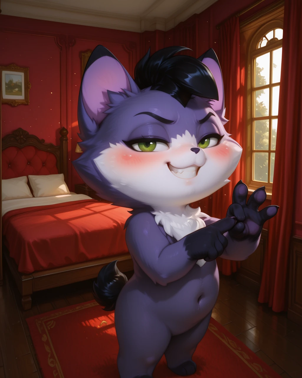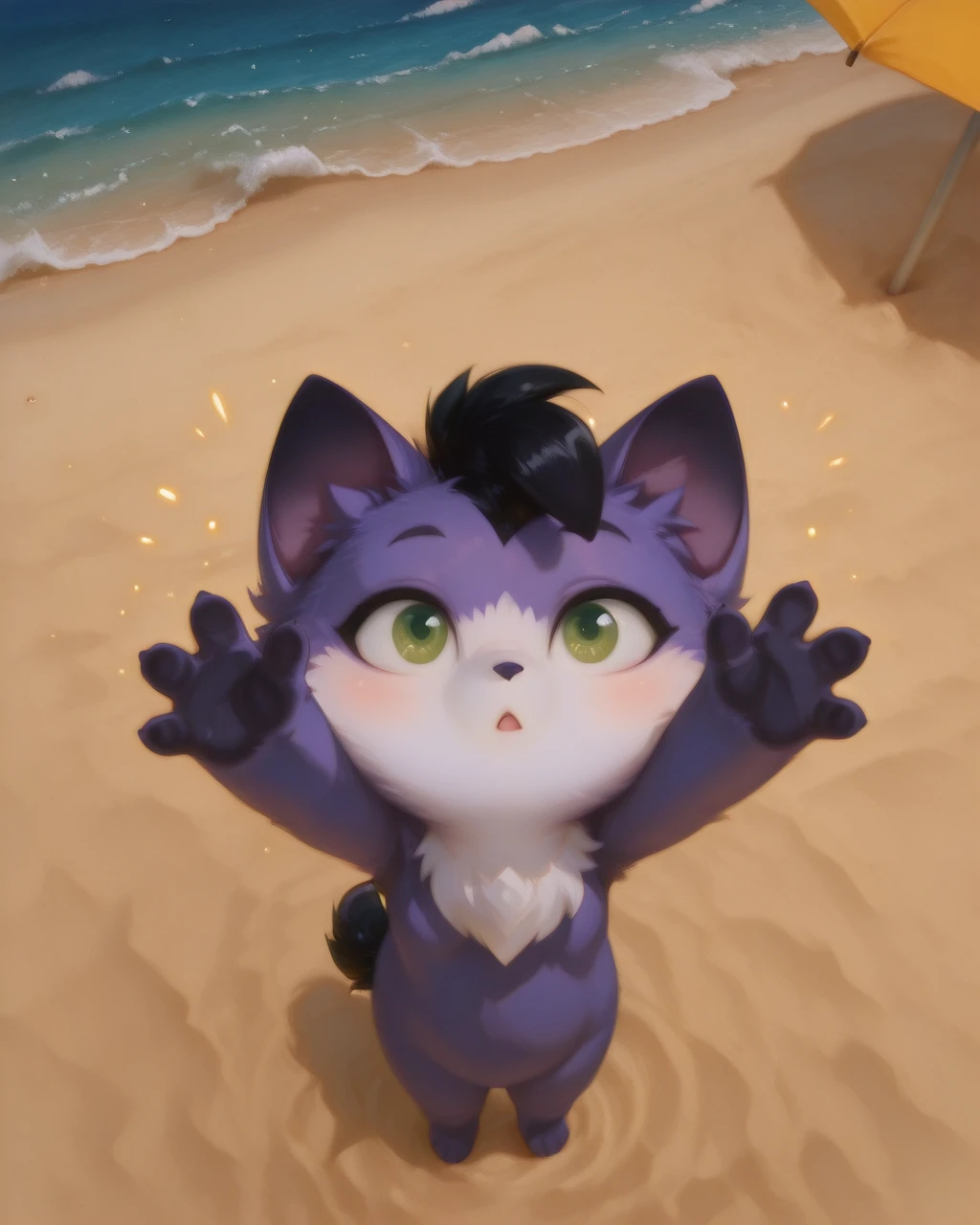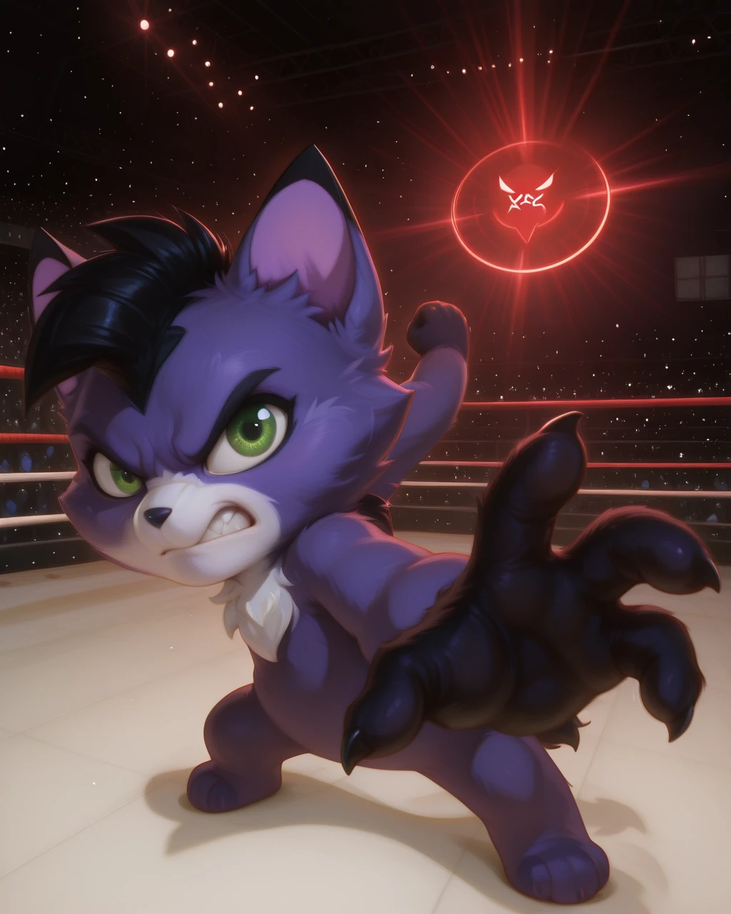 AmaruLoliRockIL2, Purple fur,green eyes, black tail, black mohawk, white face, chest fur, , dark paw tips, paw, male, chibi,