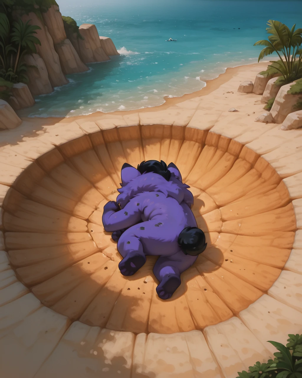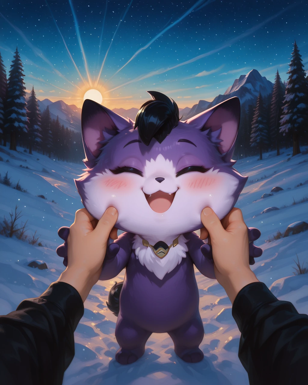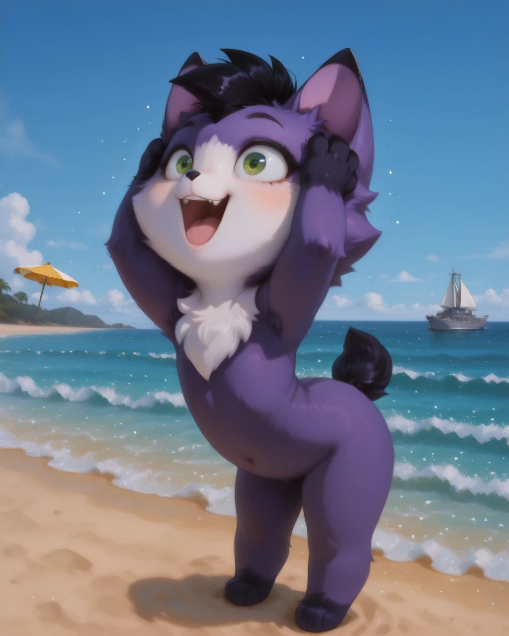 AmaruLoliRockIL2, Purple fur,green eyes, black tail, black mohawk, white face, chest fur, , dark paw tips, paw, male, chibi,