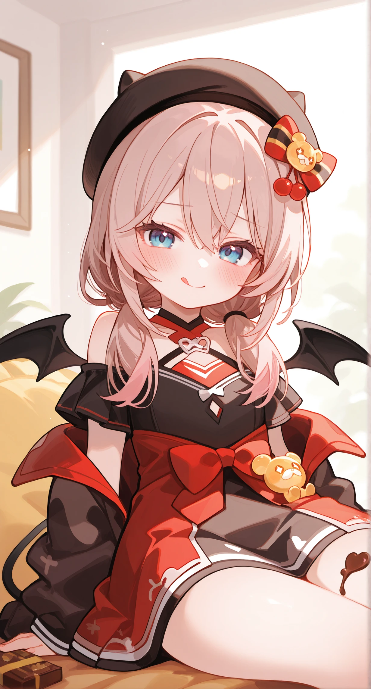 1girl, leni_\(black_survival\), solo, long hair, brown hair, pink hair, low twintails, hair between eyes, bangs, hair over shoulder, blue eyes, black beret, demon tail, demon wings, frilled short sleeves, dress, striped bow, red bow, jacket, long sleeves, off shoulder, bare shoulders, open clothes