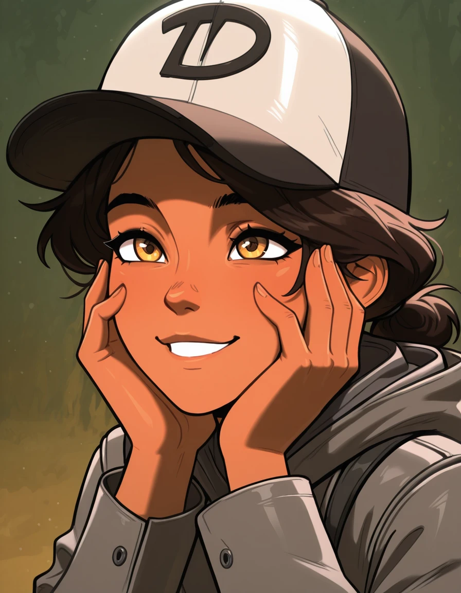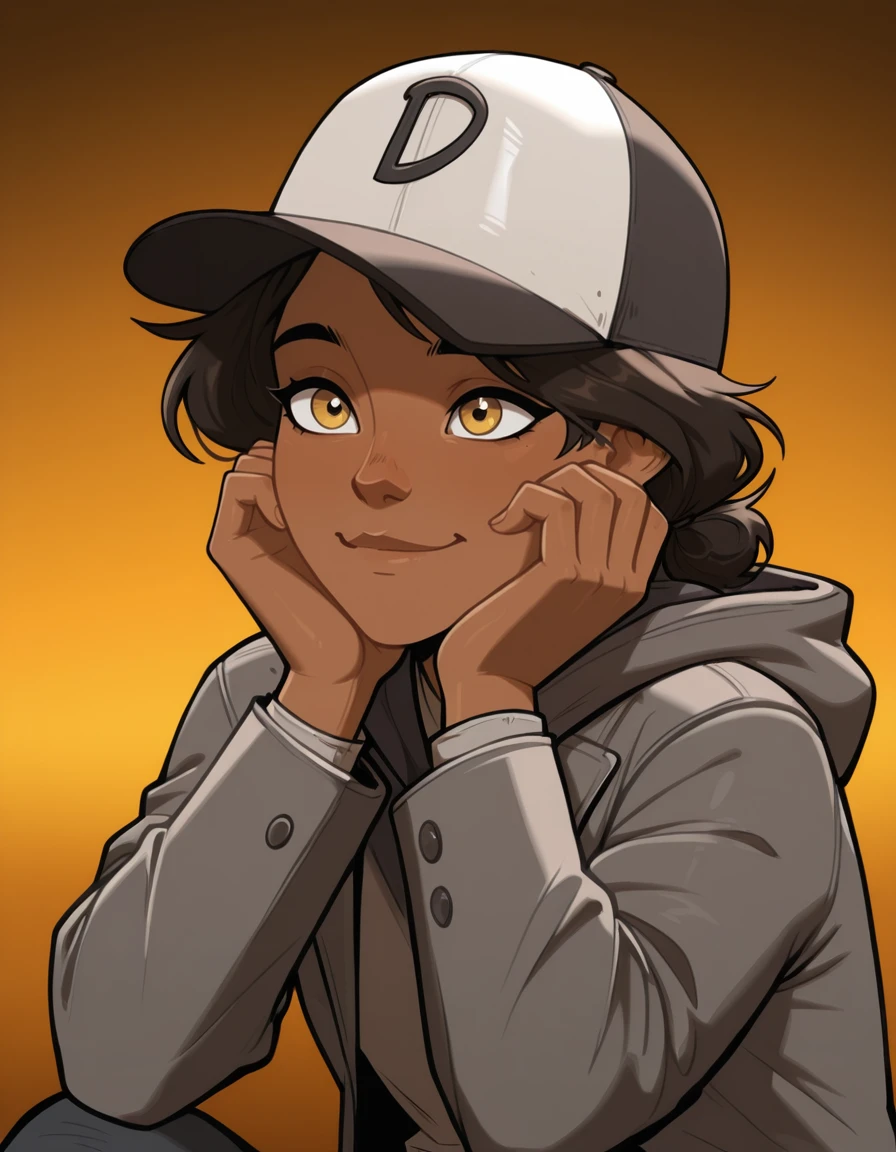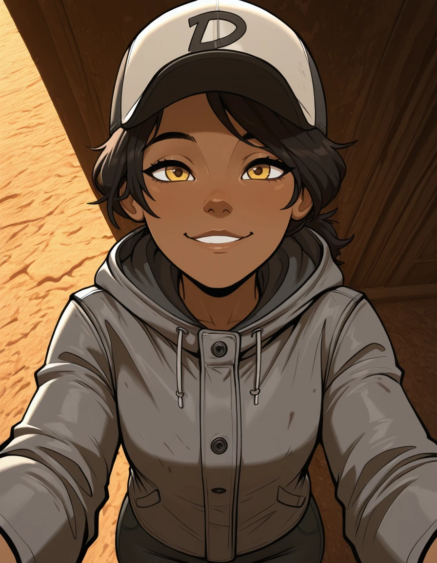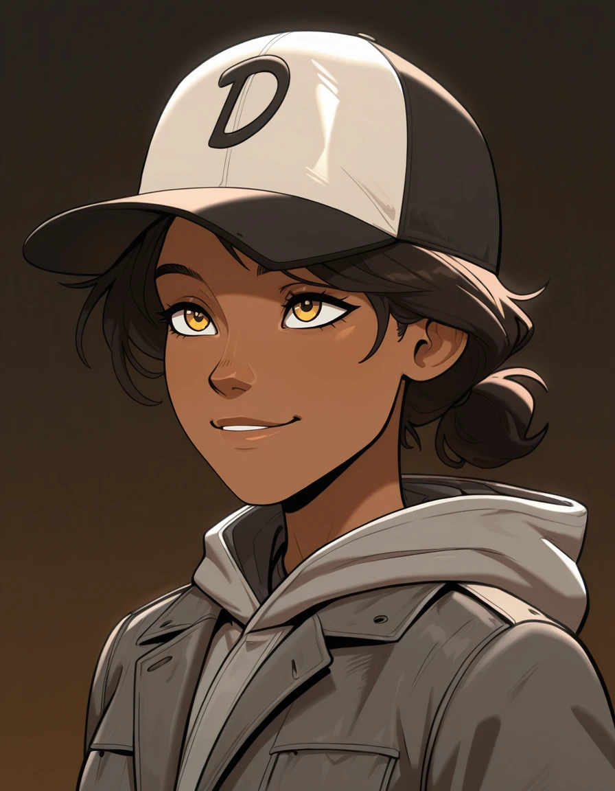 -ponpuclementine,1girl, hat,dark skin,brown eyes,yellow eyes,solo,brown hair,black hair, dark-skinned female,grey jacket,hood down,pants,