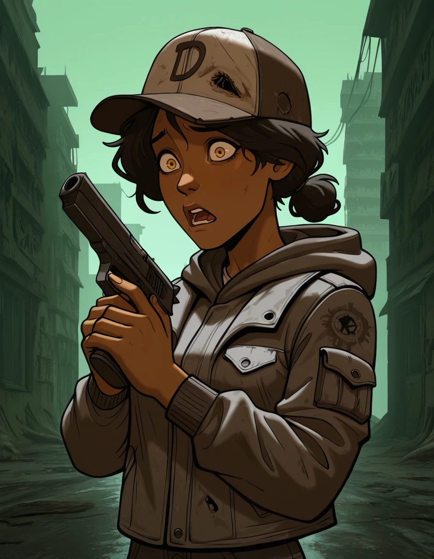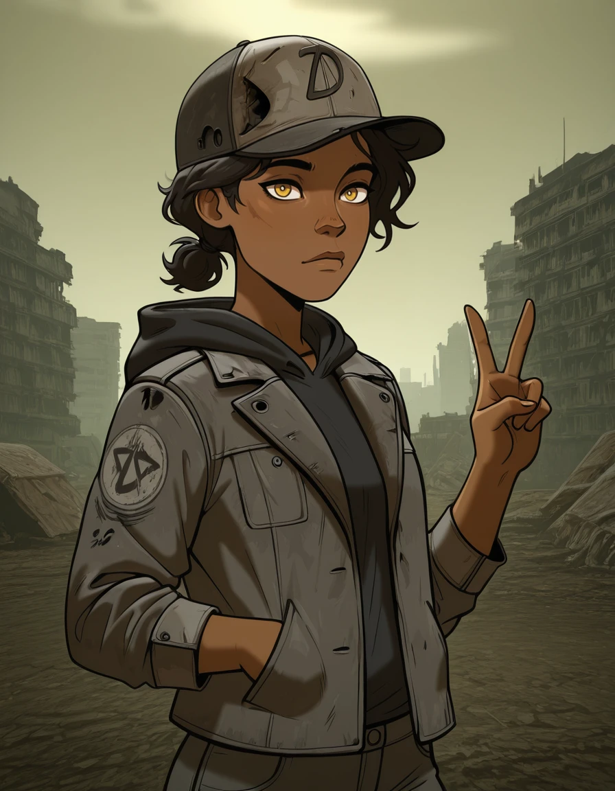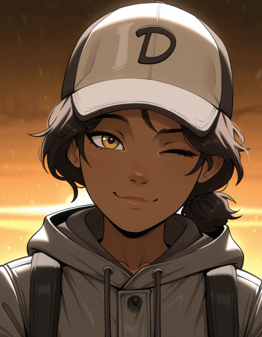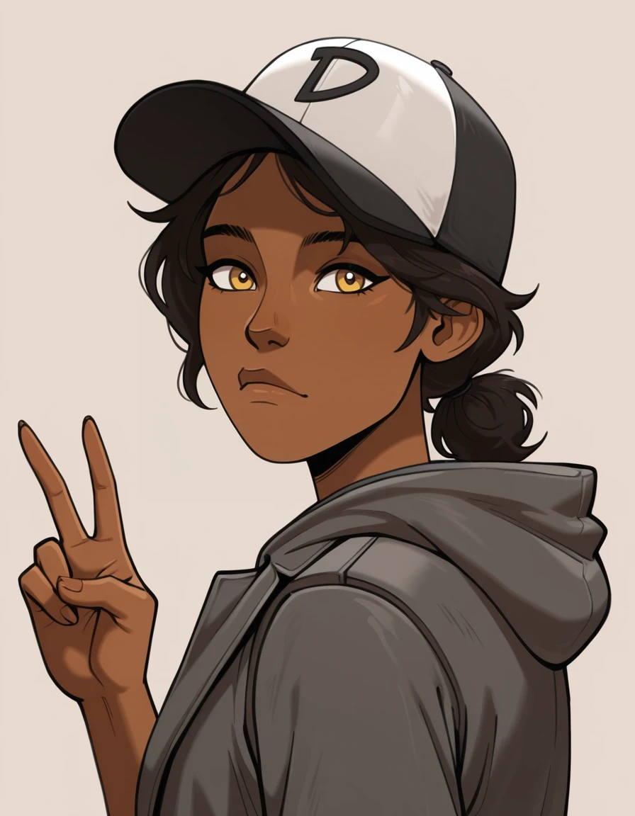 -ponpuclementine,1girl, hat,dark skin,brown eyes,yellow eyes,solo,brown hair,black hair, dark-skinned female,grey jacket,hood down,pants,