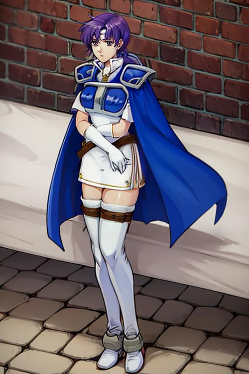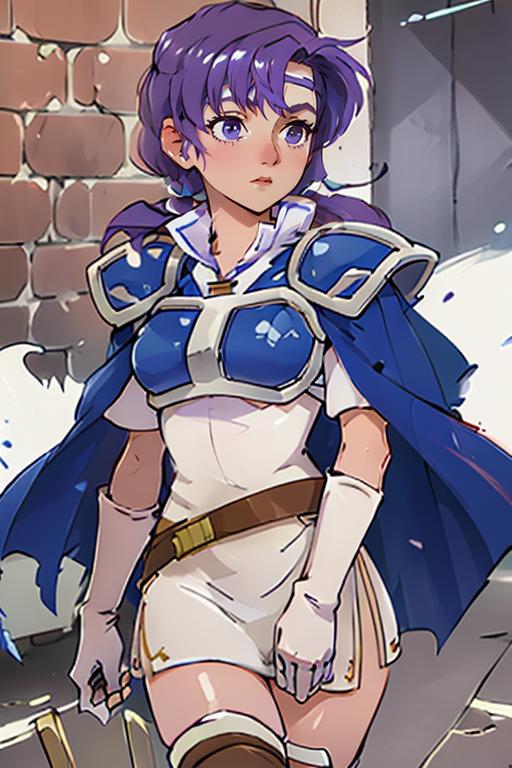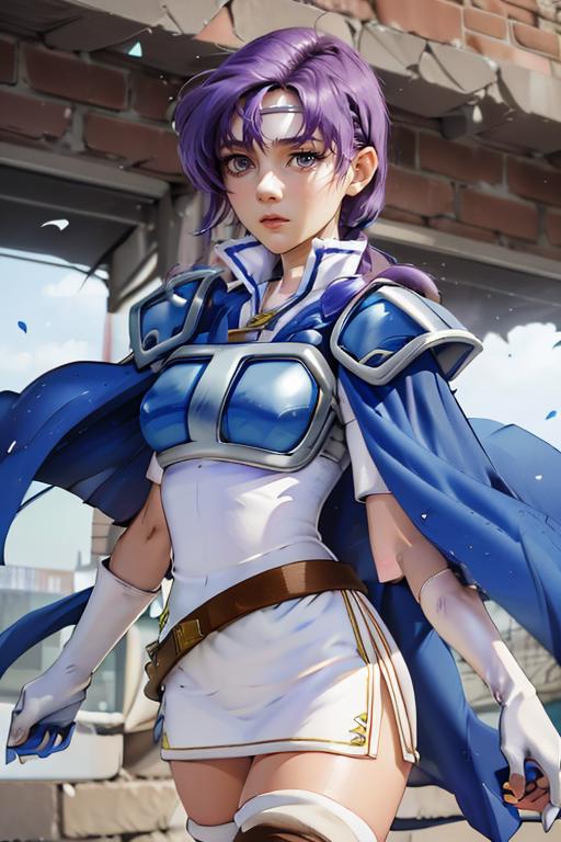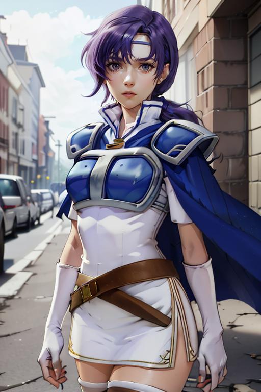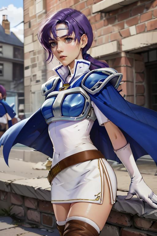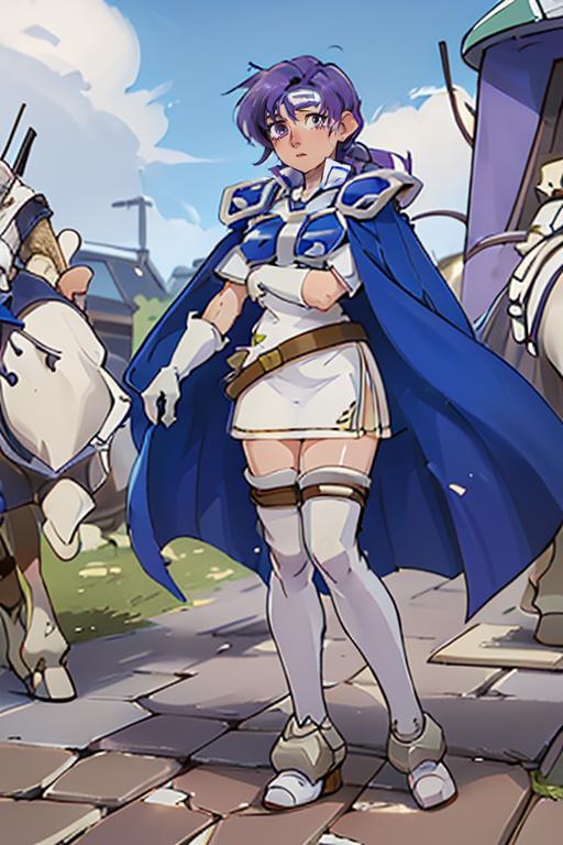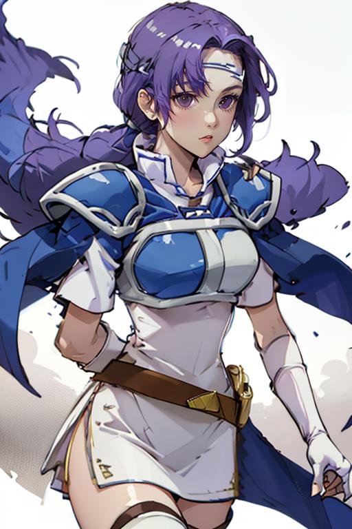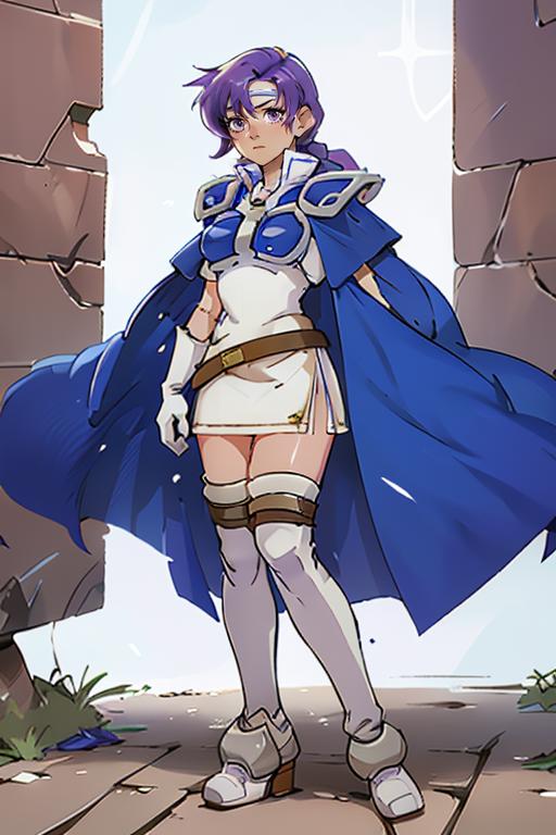 【default outfit Prompt】: juno, zettai ryouiki, thigh boots, shoulder armor, white short dress, breastplate, belt, elbow gloves, pauldrons, blue cape, white footwear, short sleeves, shoulder pads, white skirt, circlet, white thighhighs