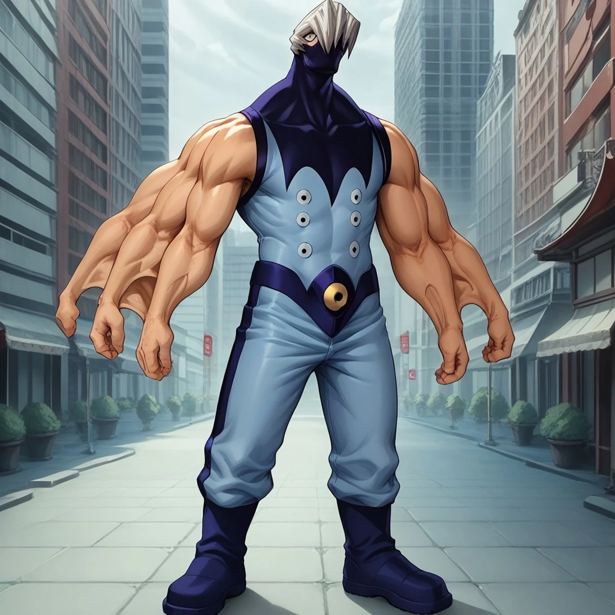 Pony tags: mezoshoji, score_9, source_anime, 1boy, solo, full body, mask, extra arms, muscular, grey hair, hero suit