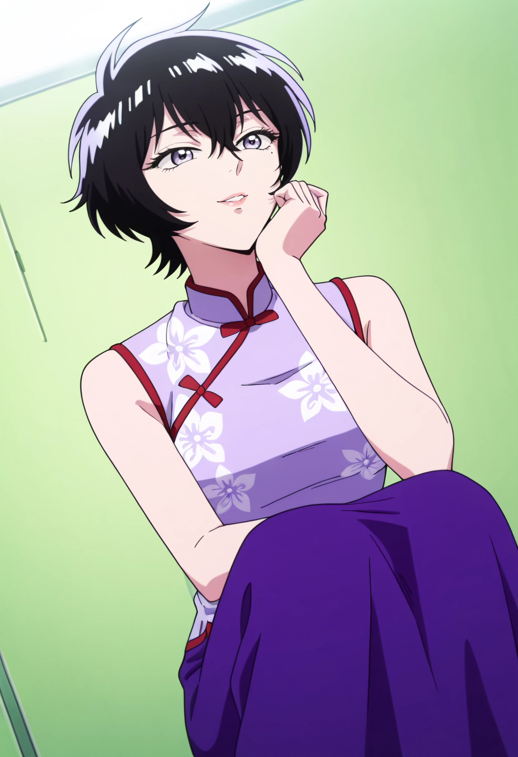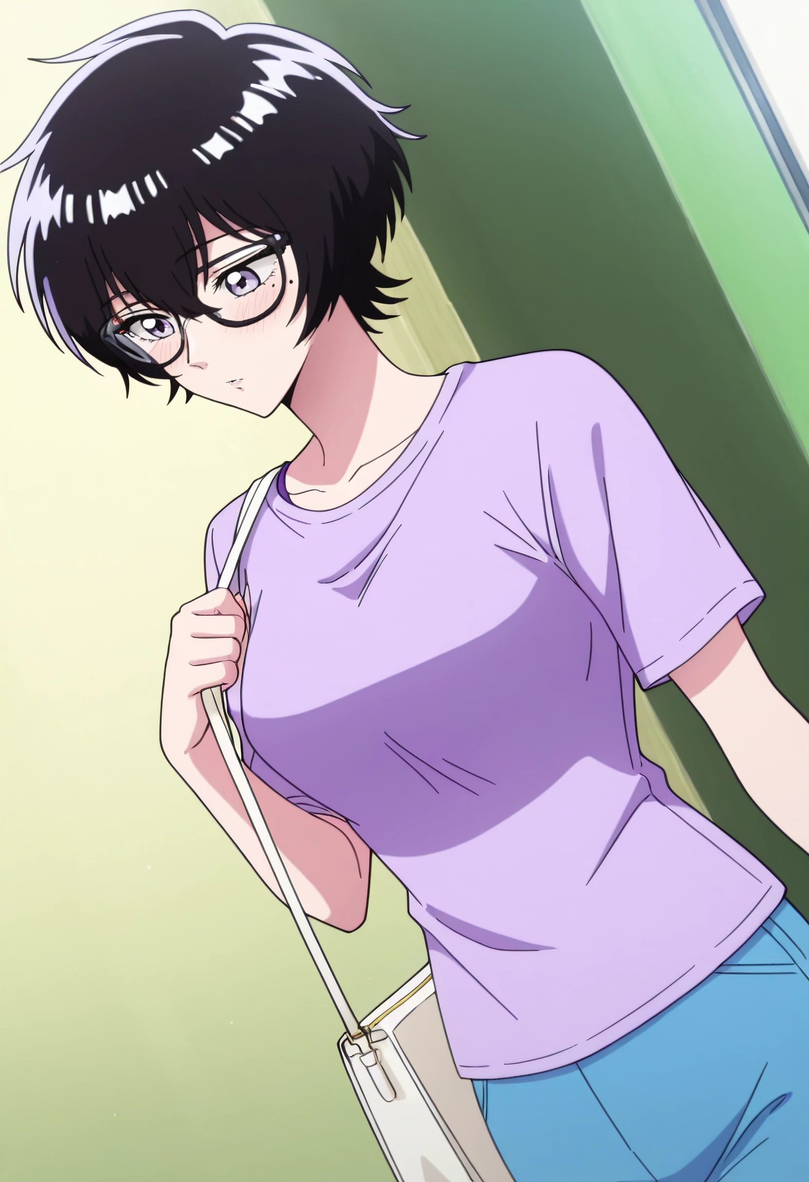 KGRReiko, short hair, black hair, hair between eyes, mole under eye, mole, purple eyes,