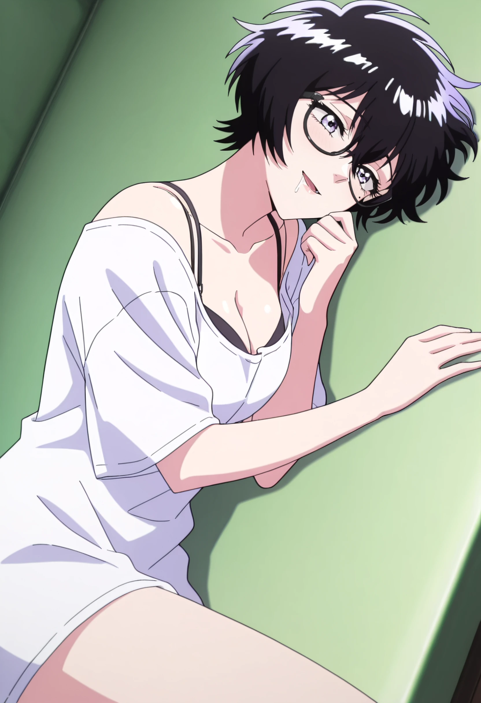 ReikoWhBottomless, shirt, white shirt, bra strap, t-shirt, short sleeves, underwear, cleavage, bra, oversized shirt, loose shirt, no pants, bare legs, black bra, oversized clothes, loose clothes, off shoulder, messy hair, off-shoulder shirt,