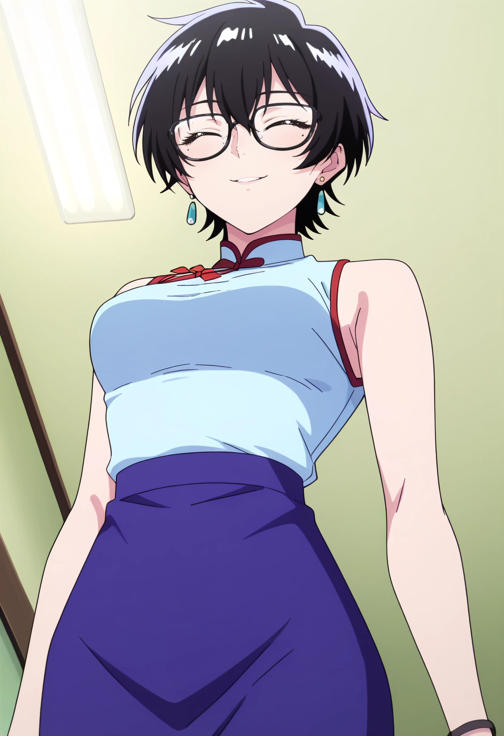 ReikoBlChShirtPuSkirtAlt, shirt, sleeveless, chinese clothes, blue shirt, sleeveless shirt, skirt, blue skirt, jewelry, earrings, shirt tucked in, high-waist skirt, pencil skirt, long skirt, wristwatch, watch,