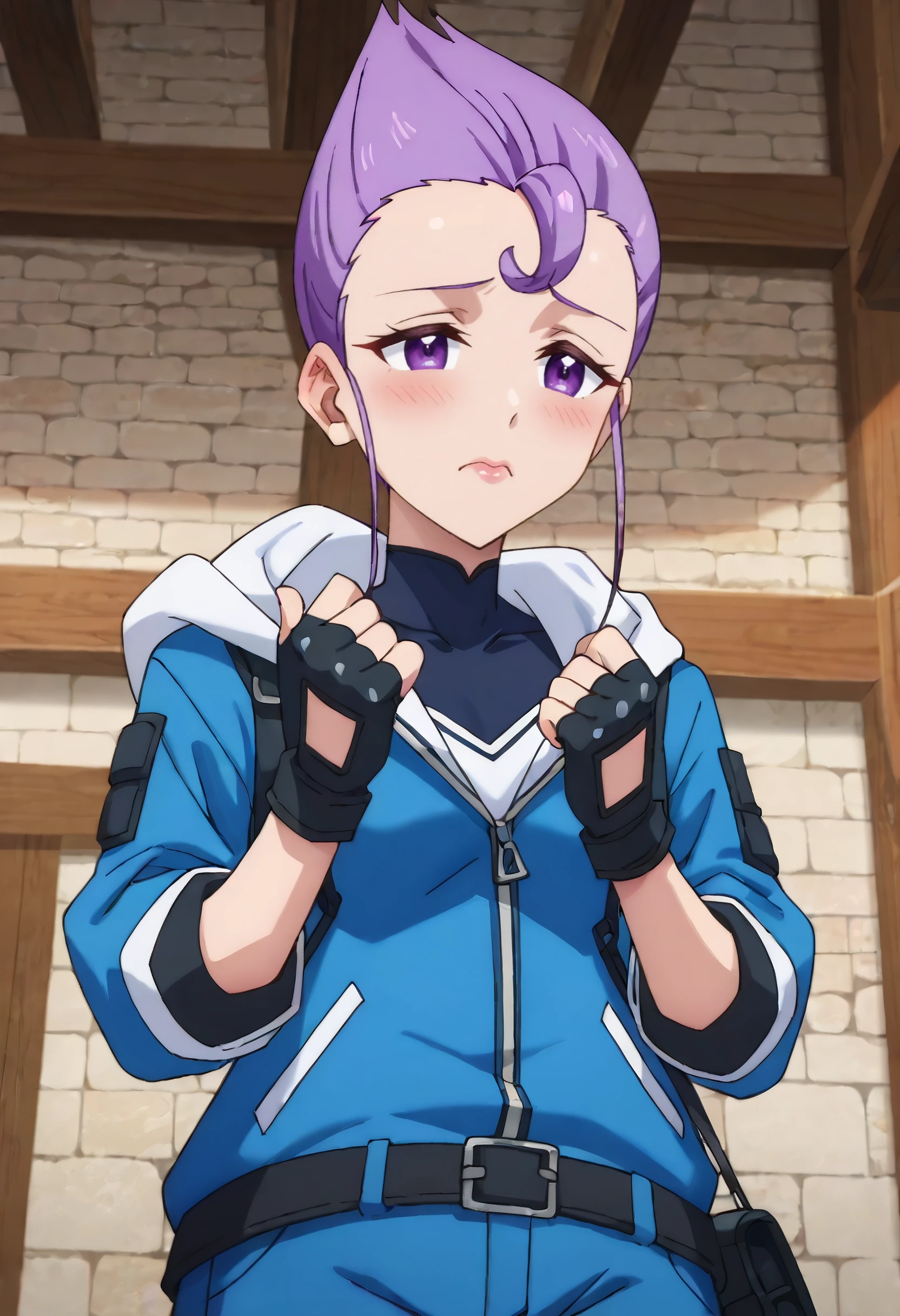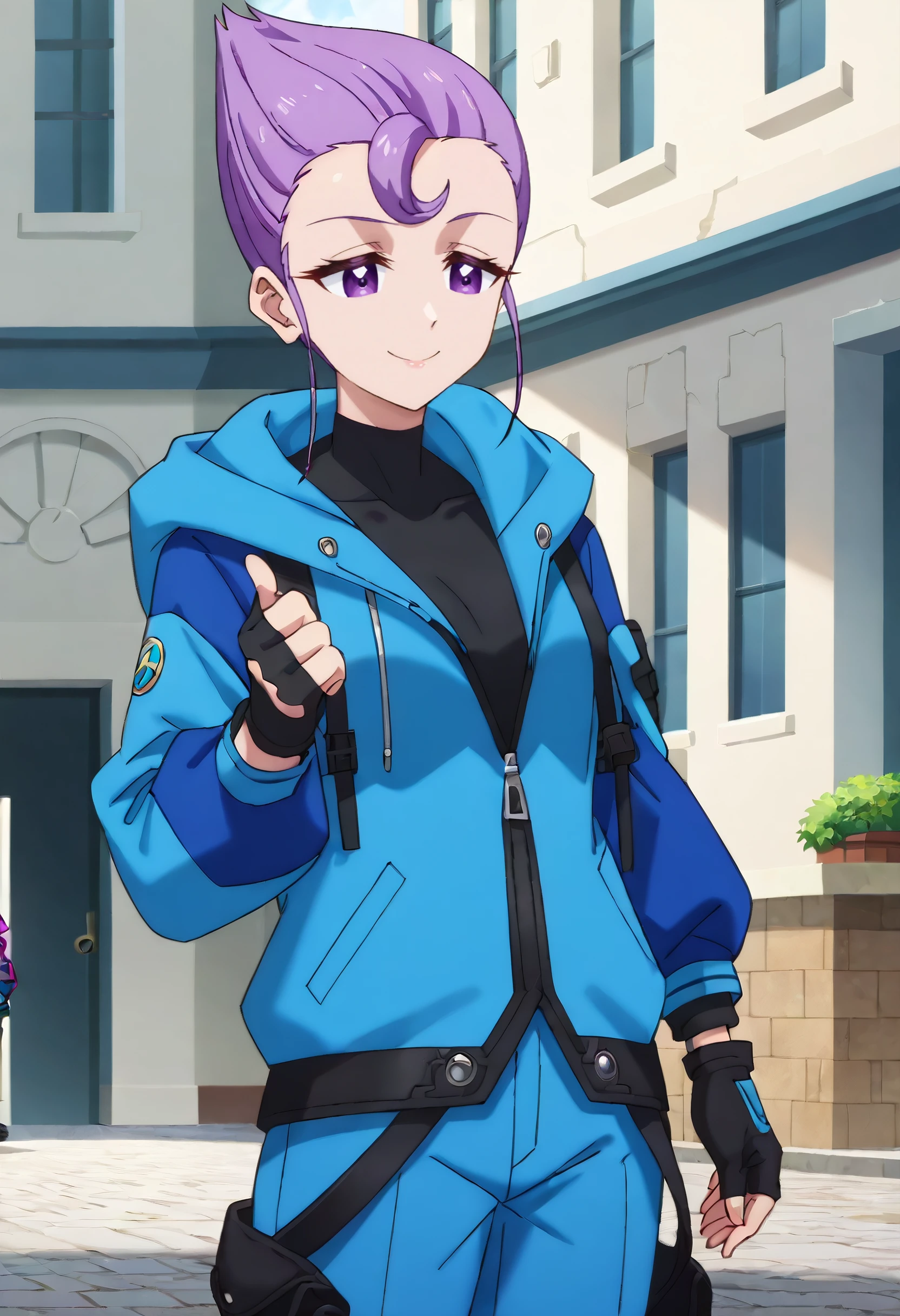 JerylJacket, gloves, fingerless gloves, jacket, hood, hood down, boots, blue jacket, long sleeves, black gloves, pants, blue pants, black boots,