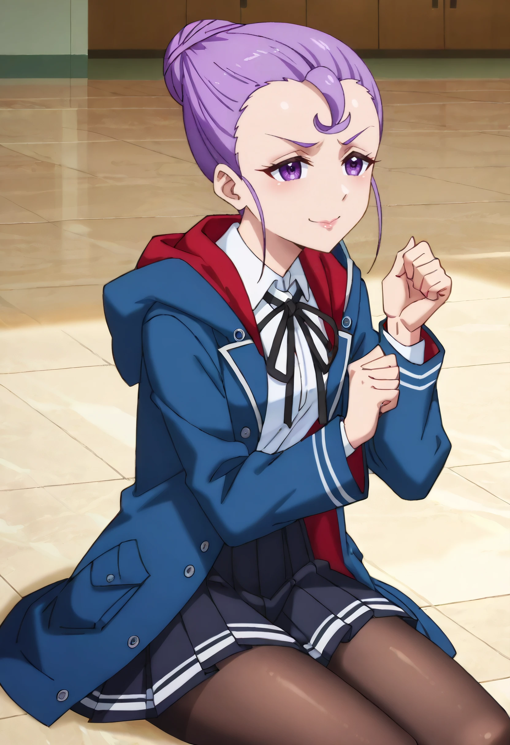 JerylSchoolB, school uniform, ribbon, neck ribbon, shirt, skirt, long sleeves, white shirt, pleated skirt, black skirt, black ribbon, coat, pantyhose, hood, collared shirt, open clothes, jacket, black jacket, open jacket,