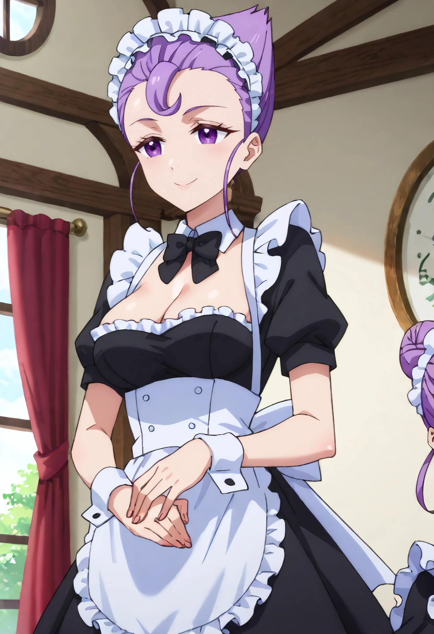 JerylMaid, maid, maid headdress, enmaided, detached collar, bow, black bow, maid apron, apron, bowtie, black bowtie, black dress, dress, puffy sleeves, wrist cuffs, puffy short sleeves, short sleeves, cleavage, white apron, frills, white collar, frilled dress, frilled apron, hair up, garter straps, thighhighs,