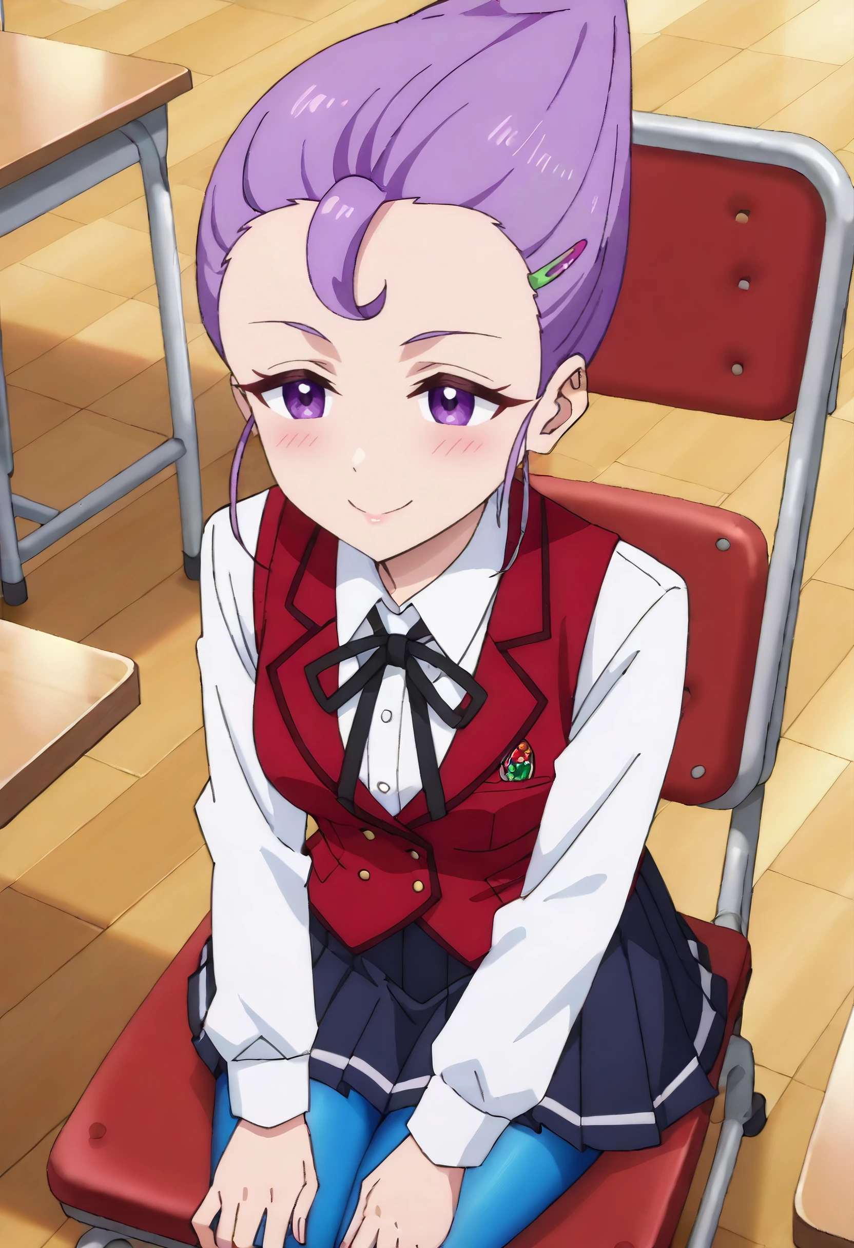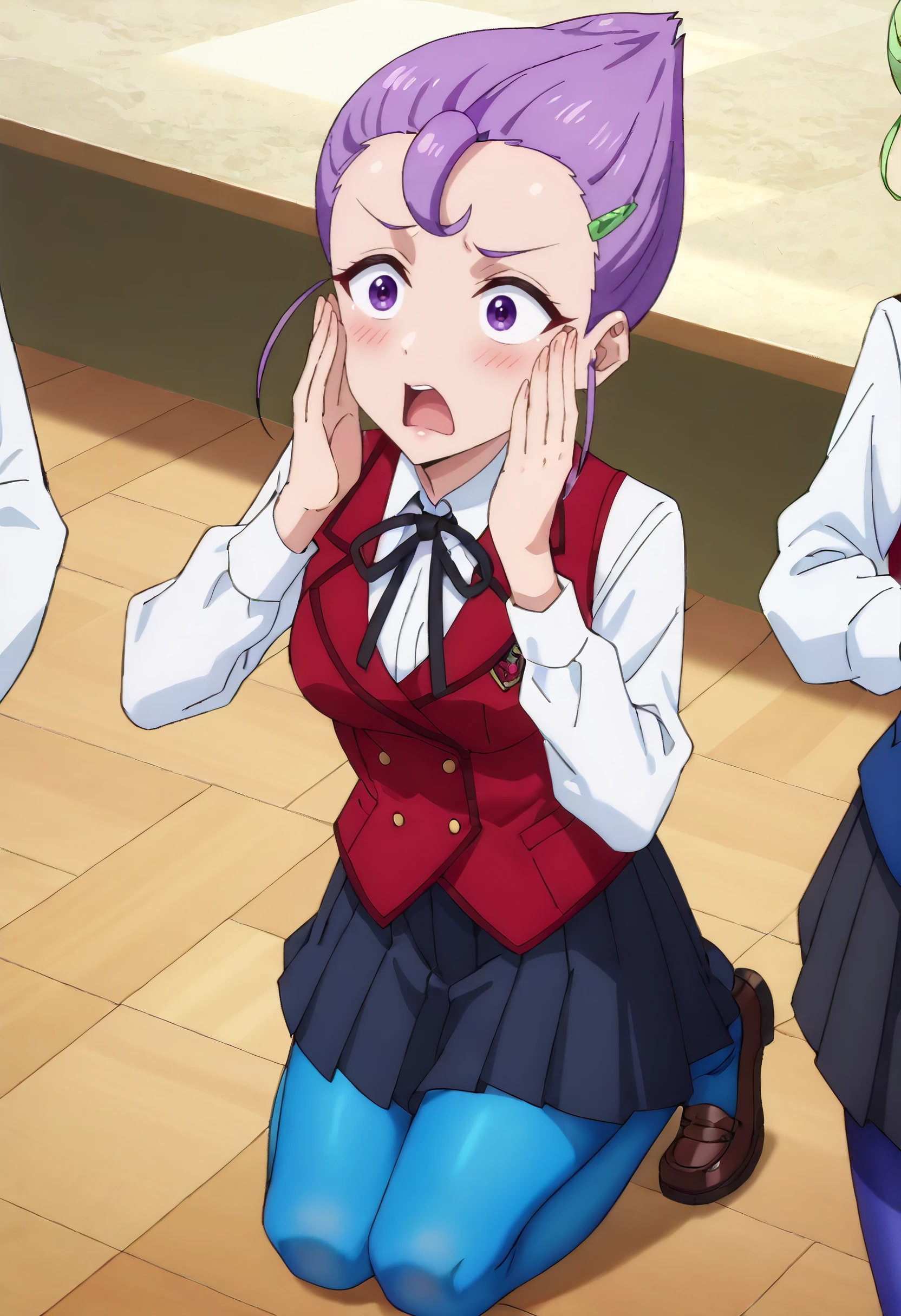 JerylSchoolA, school uniform, vest, ribbon, white shirt, shirt, black ribbon, skirt, neck ribbon, pantyhose, blue pantyhose, pleated skirt, hair up, collared shirt, long sleeves, black skirt, red vest, hairclip,