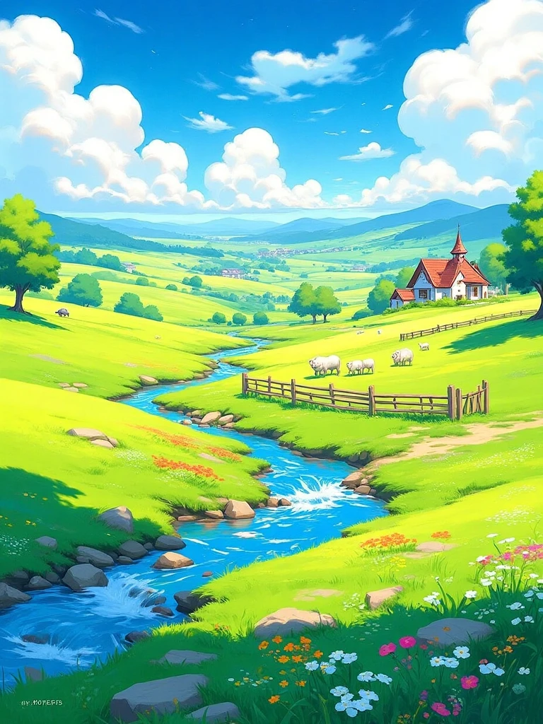 Anime - style landscape paintings, lush green hills, a stream cascading down, creating small waterfalls, sheep grazing nearby, scattered clouds, bright and cheerful atmosphere.