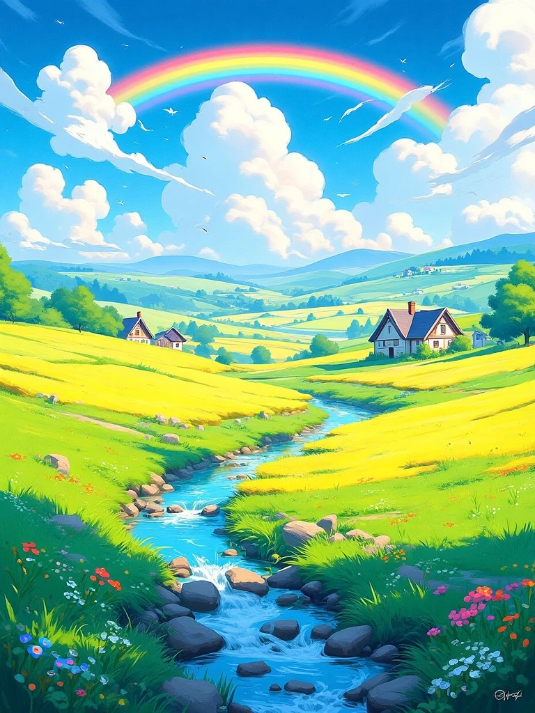 Anime - style landscape paintings, a path of stones in a flower - filled meadow, a rainbow spanning the sky, quaint houses on a hill, fluffy clouds floating, warm sunlight shining.