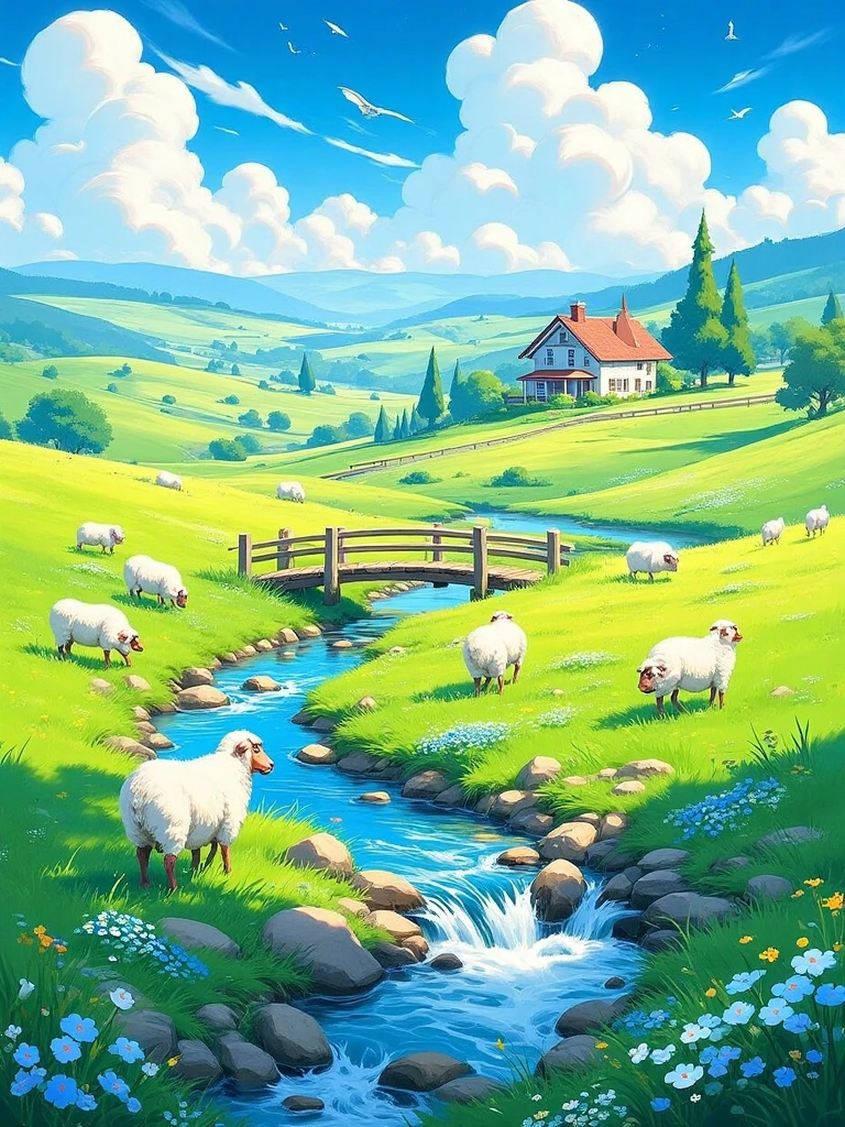 Anime - style landscape paintings, rolling hills covered in lush grass, a small brook flowing, cute sheep resting by it, scattered cottages, bright blue sky with cotton - like clouds.