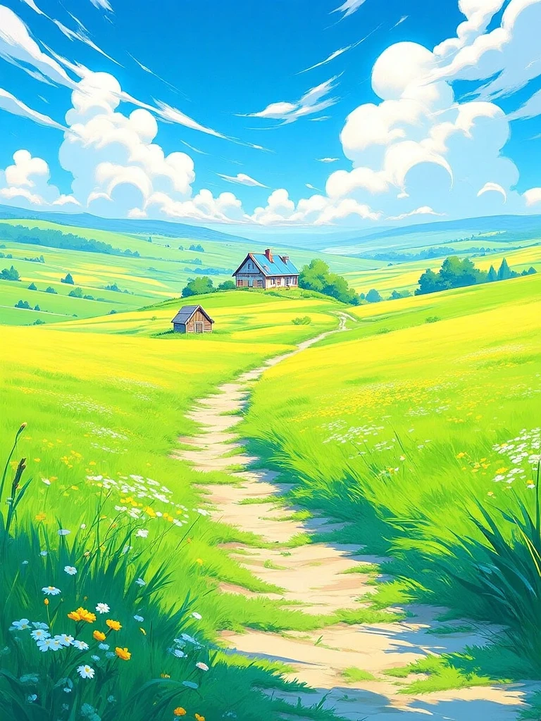 Anime - style landscape paintings, vast grassland under blue sky, old - fashioned steam train chugging, fluffy clouds drifting, small streams meandering, colorful wildflowers blooming.