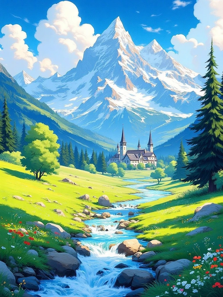 Anime - style landscape paintings, majestic snow - capped mountains in the distance, a winding river through green valleys, cozy villages nestled, vibrant flowers along the banks, sunny weather.