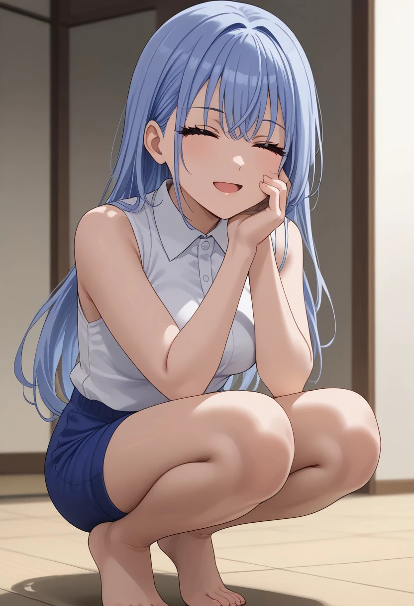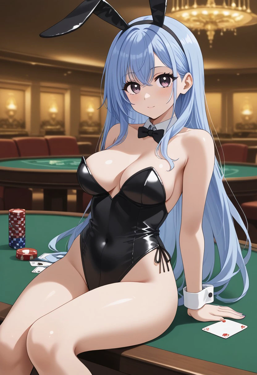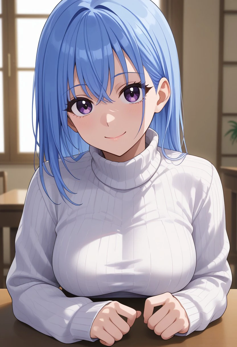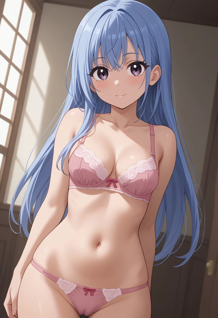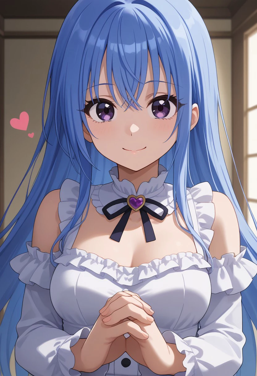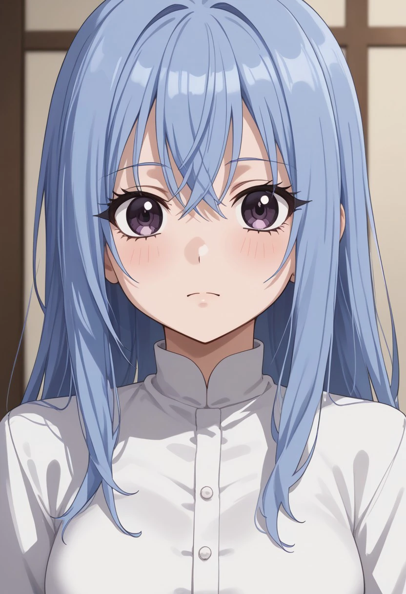 hanasuzuki, long hair, pale blue hair, purple eyes, black eyes, medium breasts