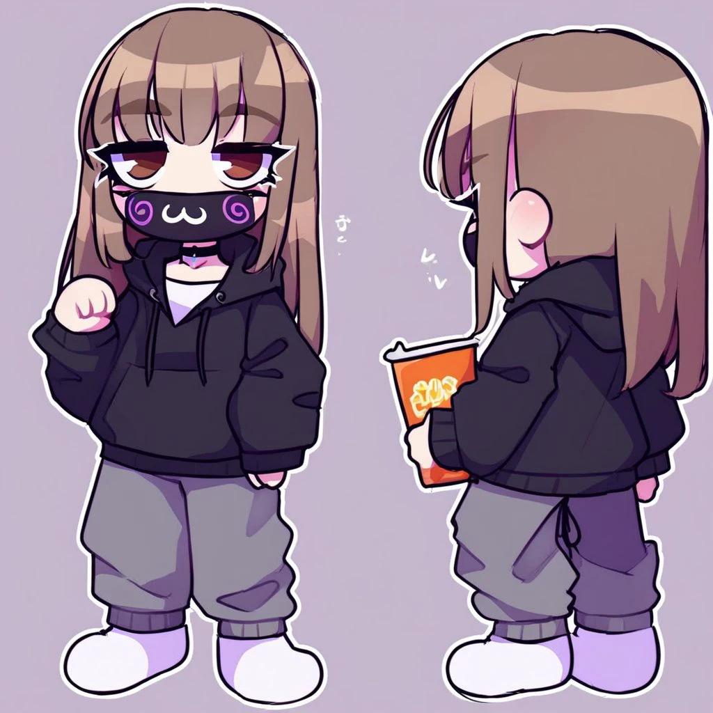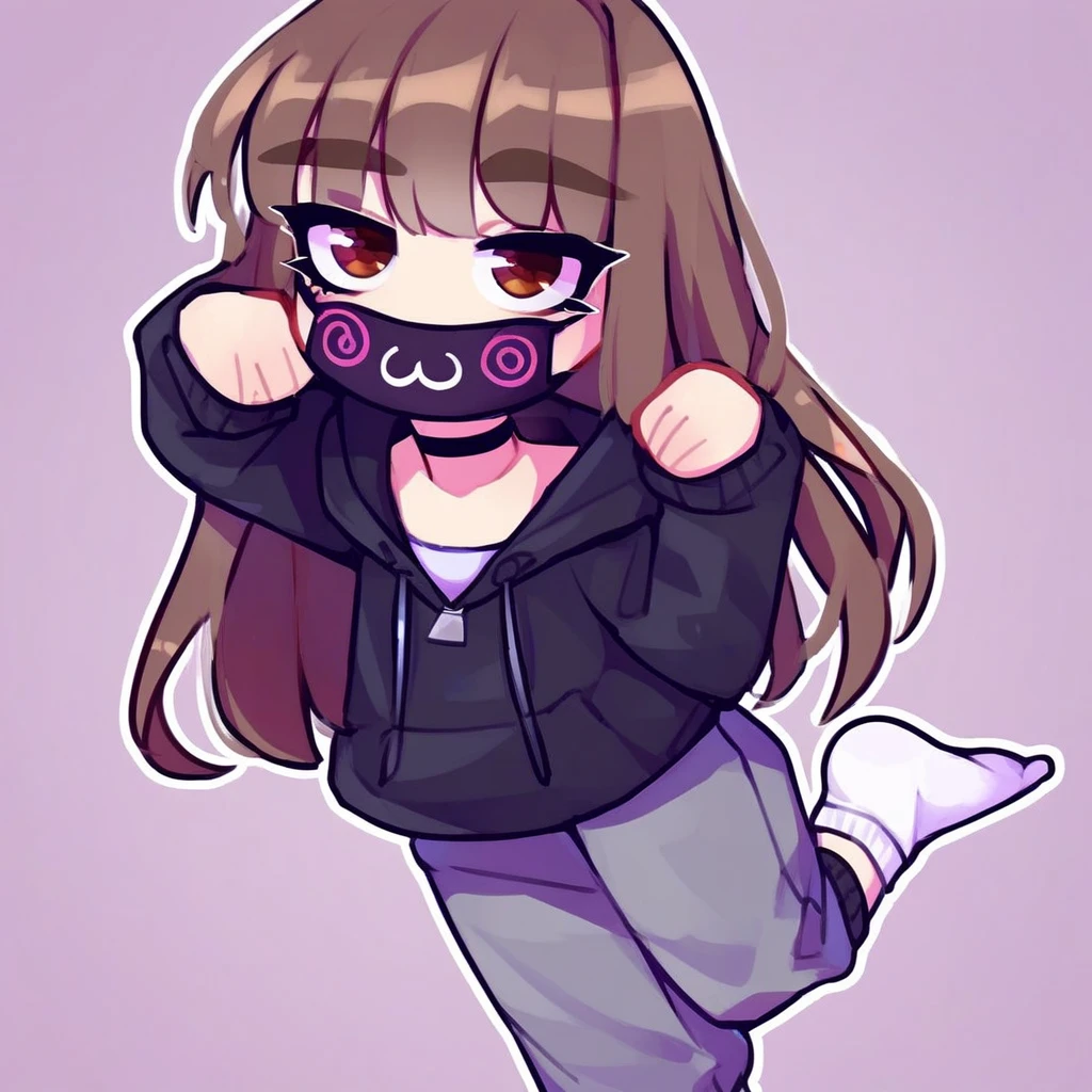 Paula,1girl,Brown hair,mask with :3 symbol,choker,bangs, hoodie,baggy gray pants,white socks,Long hair