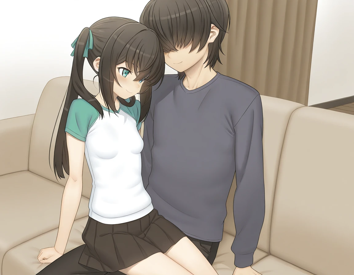 brother and sister, 1boy, adult male, couch, hair over eyes, short hair,