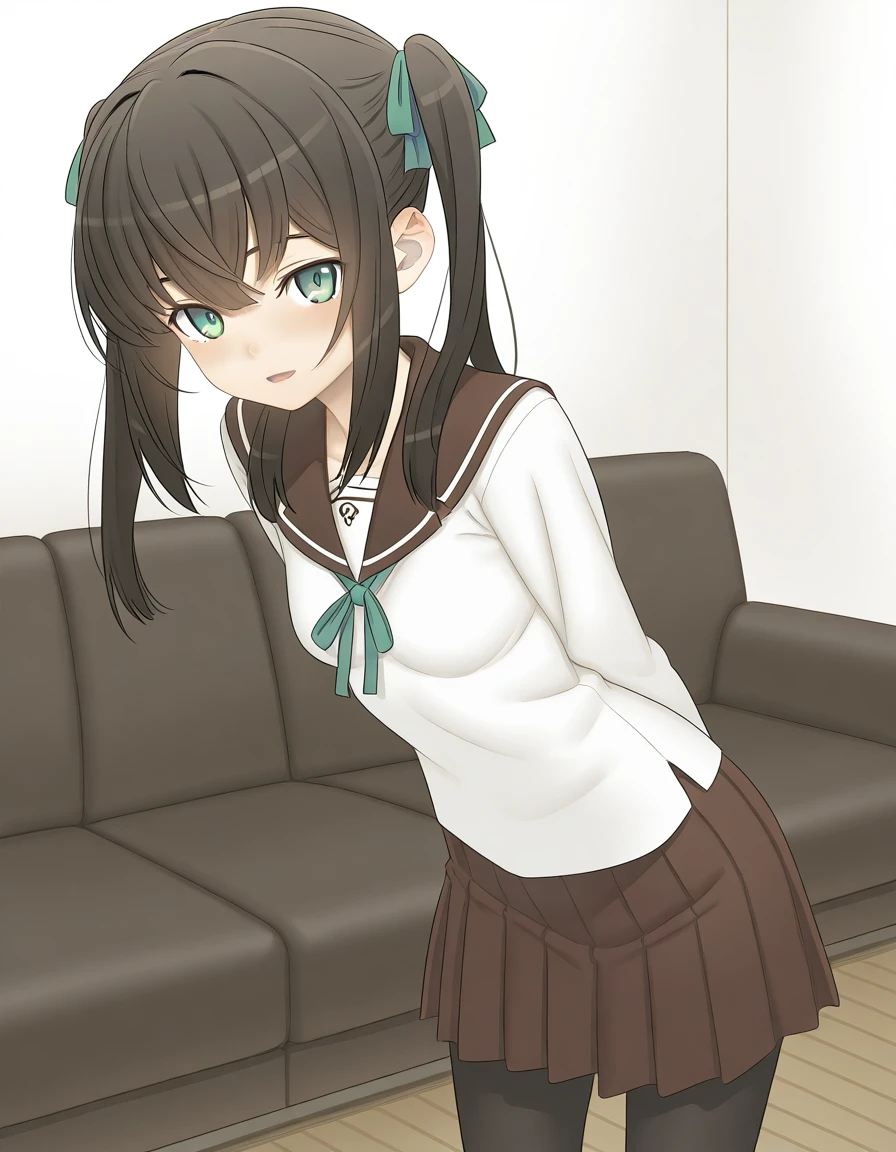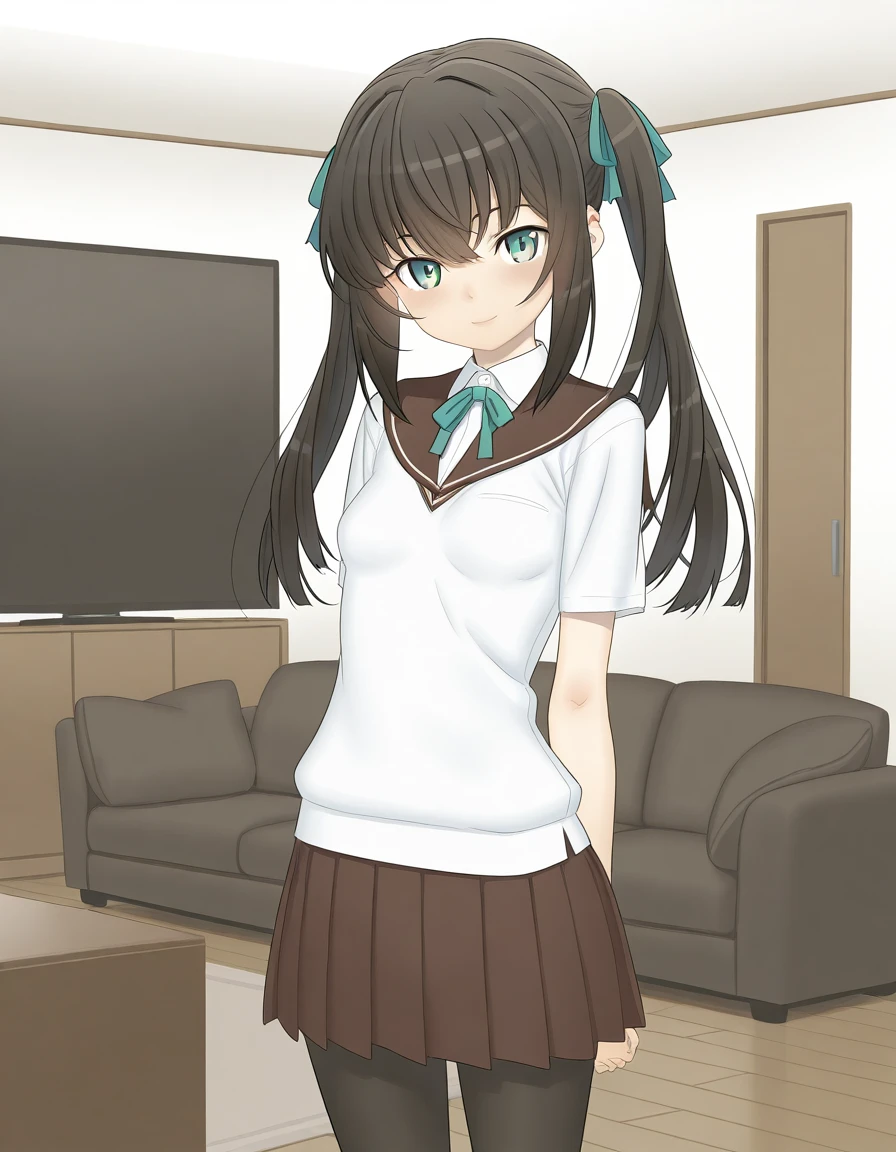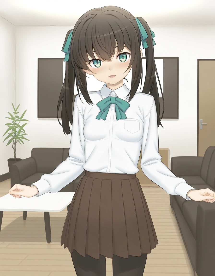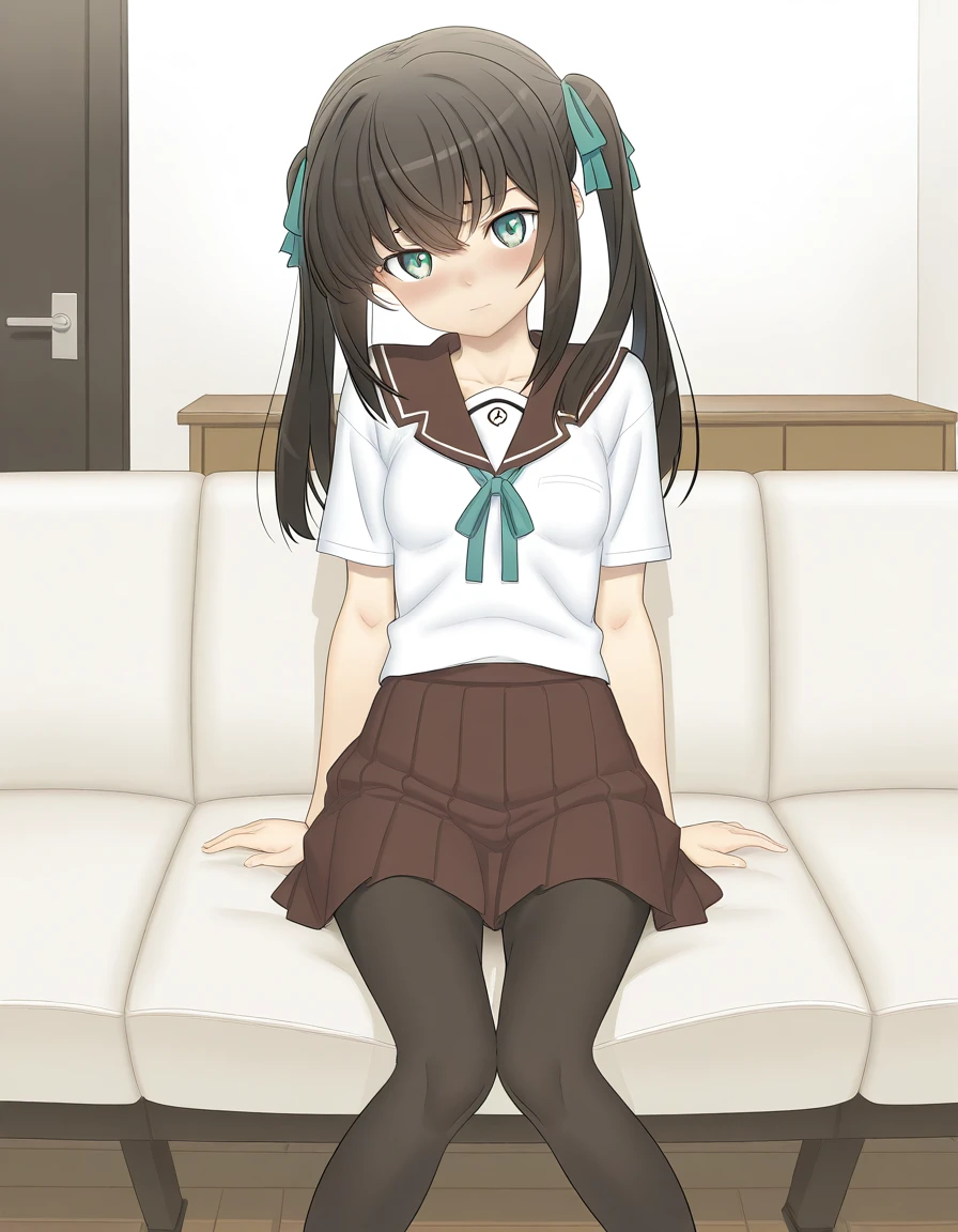shino(Kyoudai_no_Jouji_Jijou), 1girl,solo, black hair,long hair, hair ribbon, aqua ribbon, twintails, green eyes, small breasts, bangs,