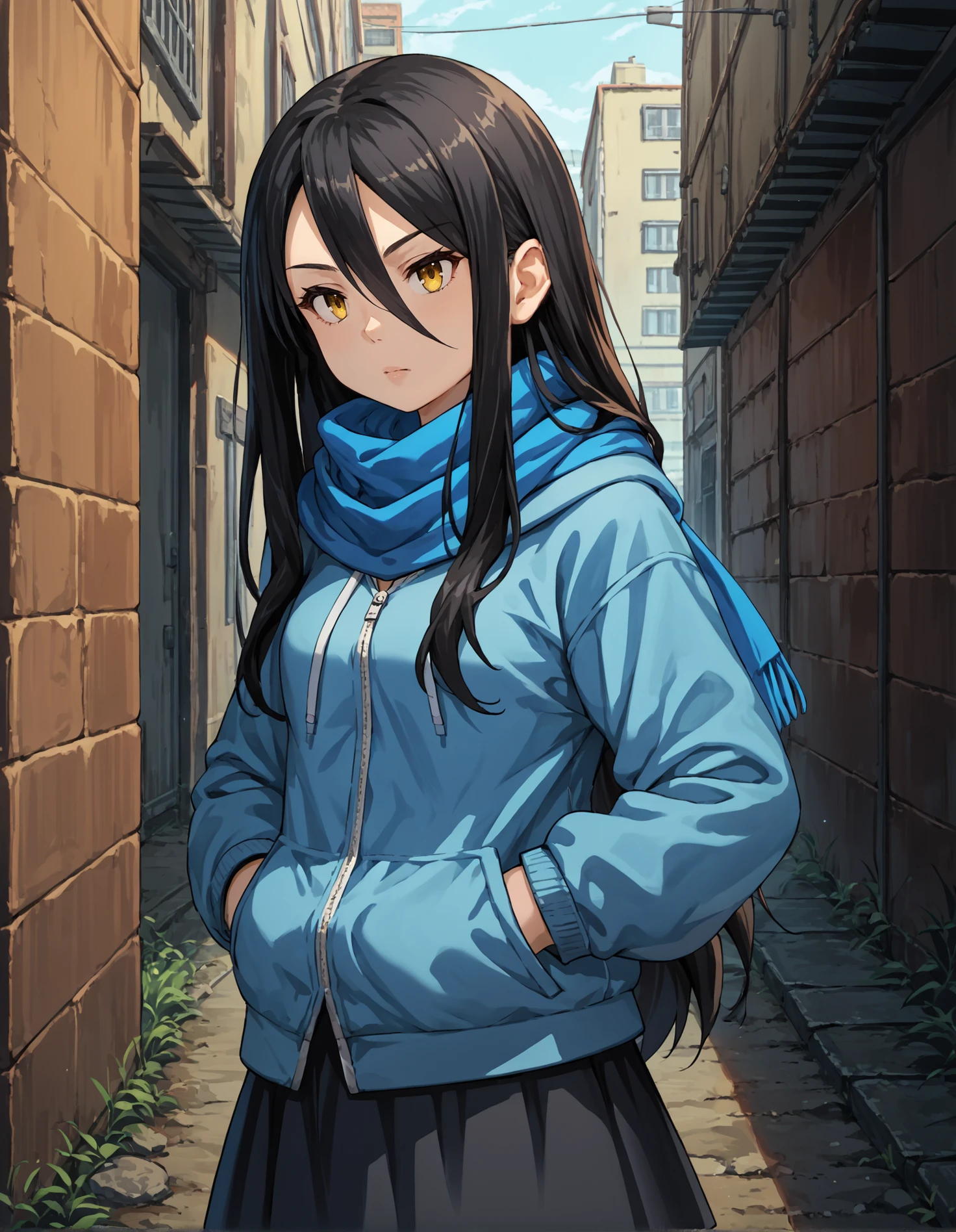 Appearance: black hair, long hair, yellow eyes