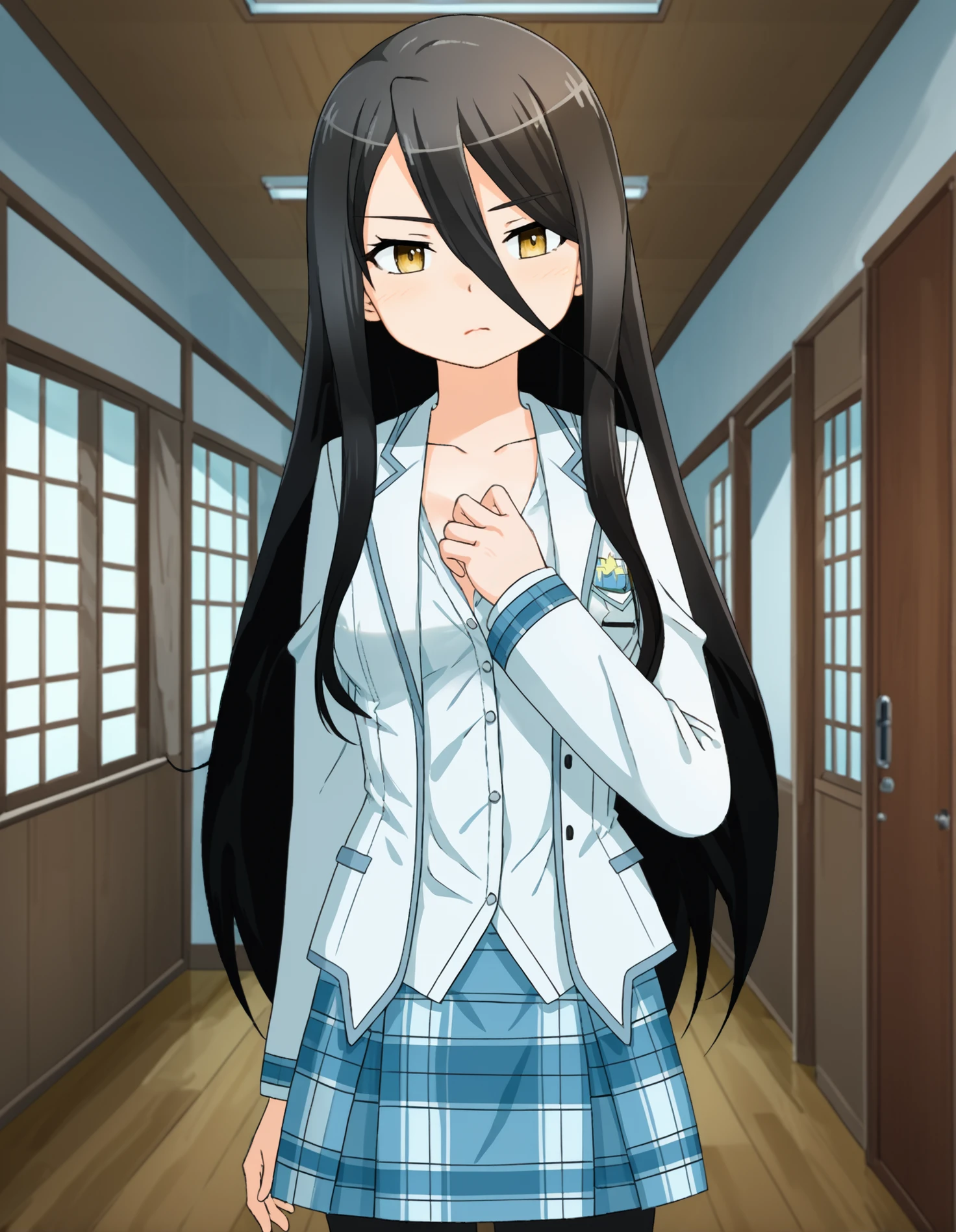 pmmmrizhawkwood, rizpbc, black hair, long hair, yellow eyes, white blouse, white open blazer, blue plaid skirt