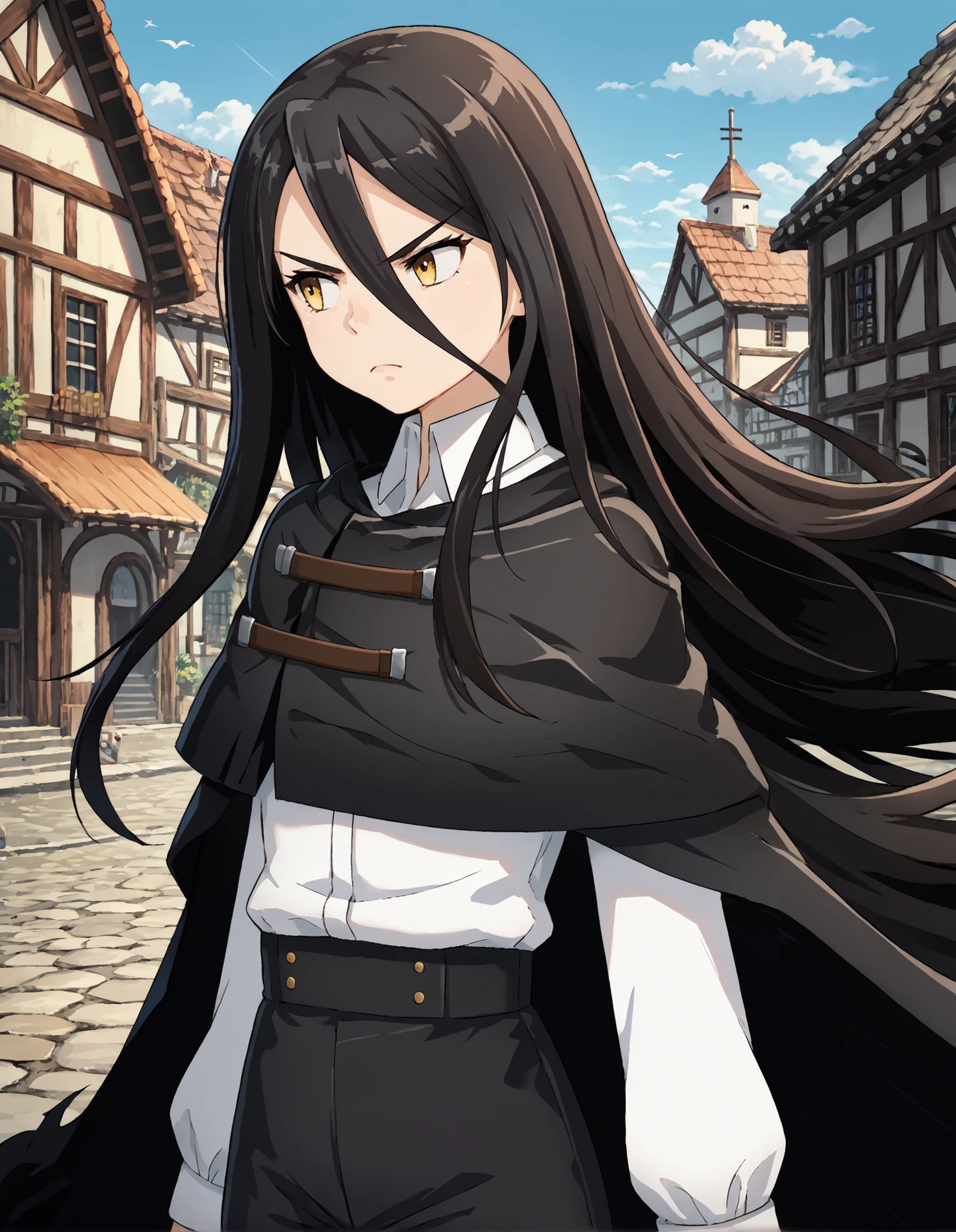 pmmmrizhawkwood, rizcsl, black hair, long hair, yellow eyes, white shirt, black cloak, black high-waist pants