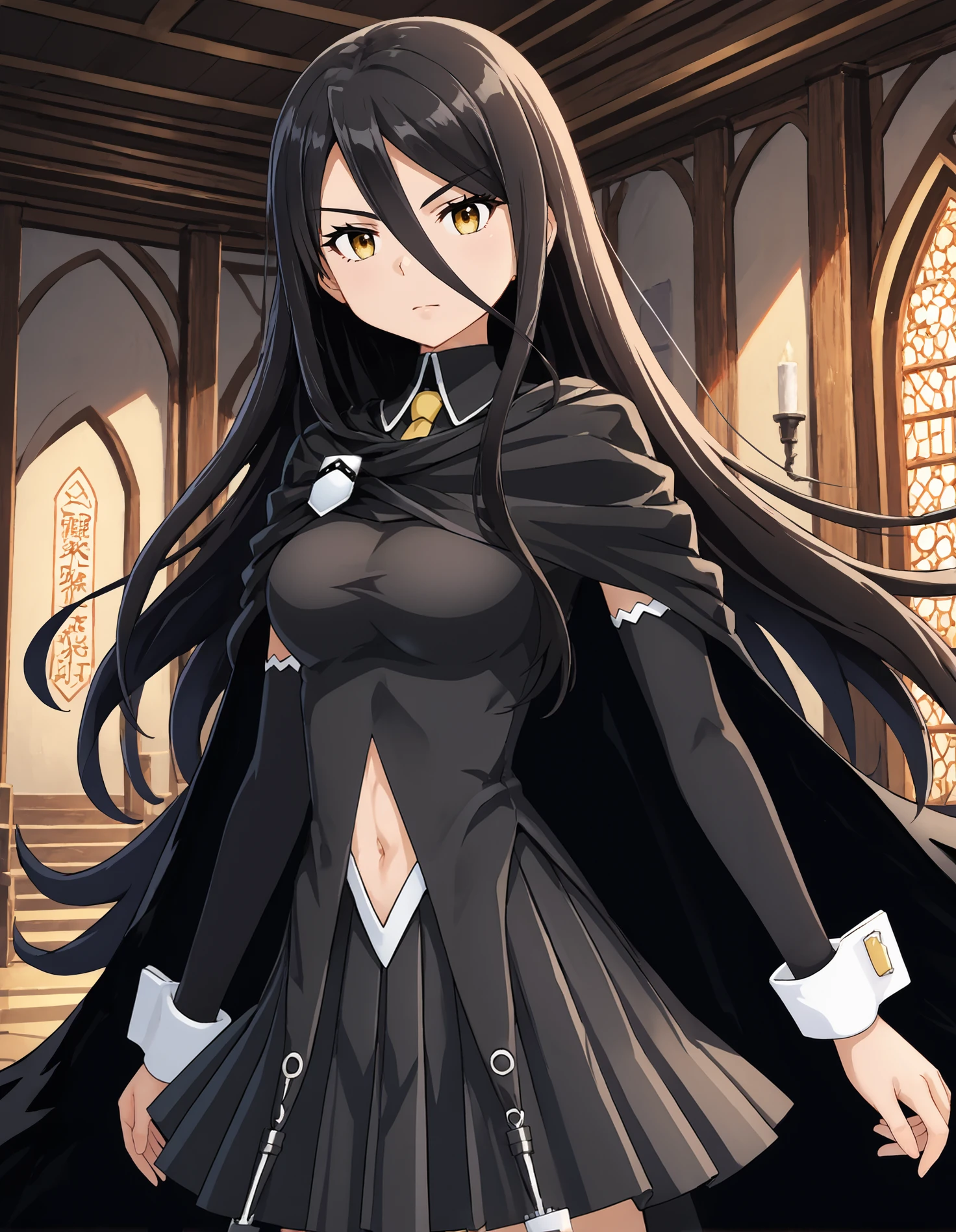 pmmmrizhawkwood, rizmgc, black hair, long hair, yellow eyes, black tunic, black detached sleeves, black cape, yellow tie, white brooch, white wrist cuffs, black pleated skirt, kunai
