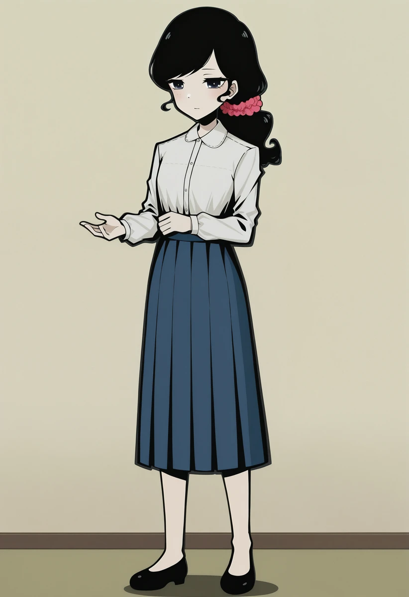 collared shirt,dress shirt,white shirt,long sleeves,long skirt,pleated skirt,blue skirt,black footwear,