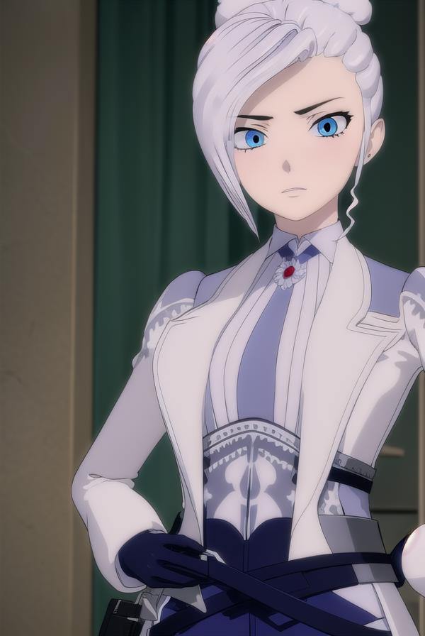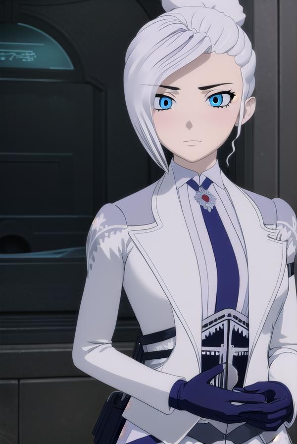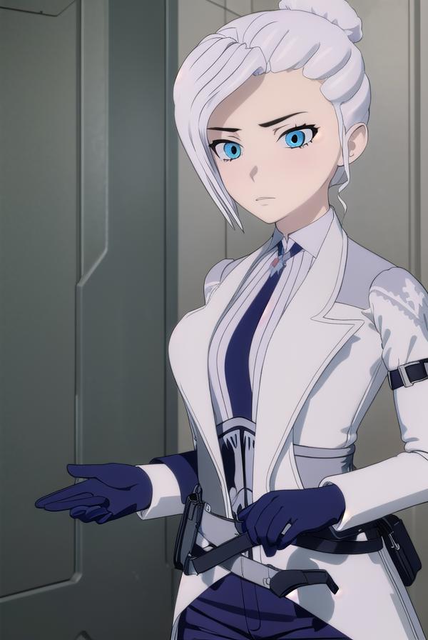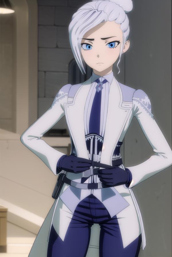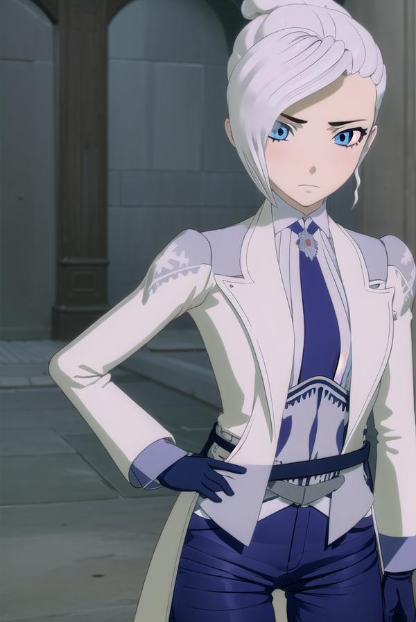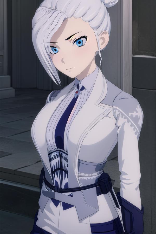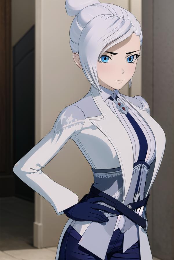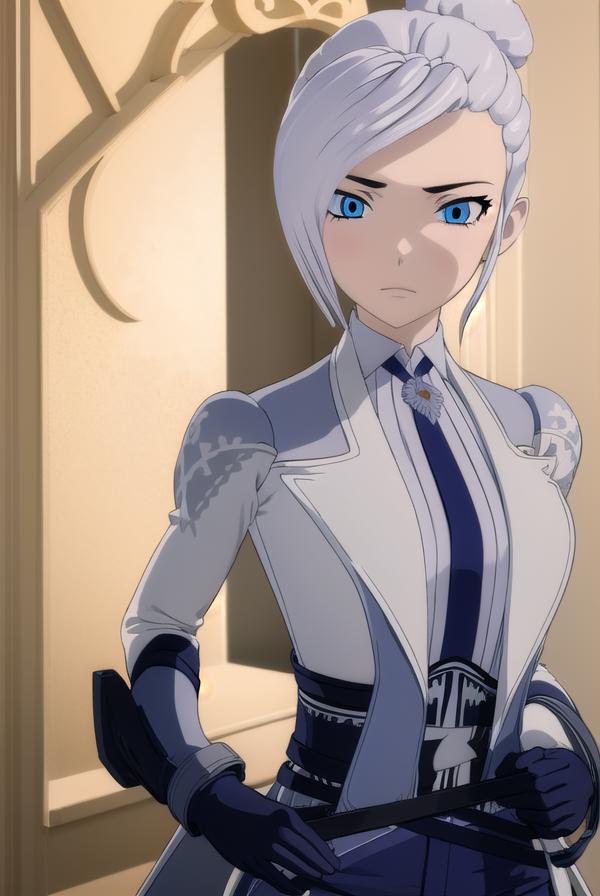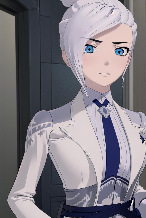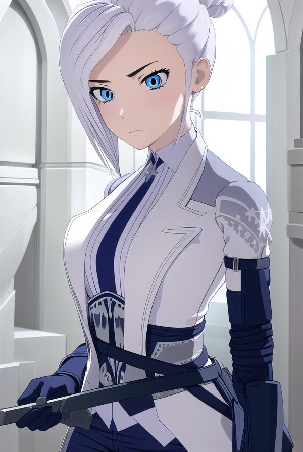 winter schnee, blue eyes, white hair, hair bun, single hair bun,