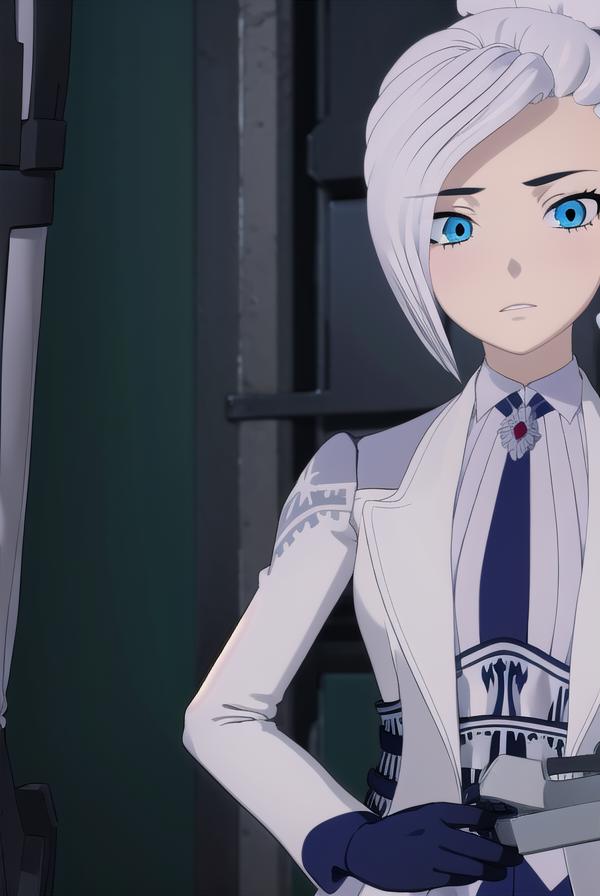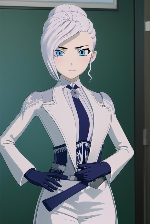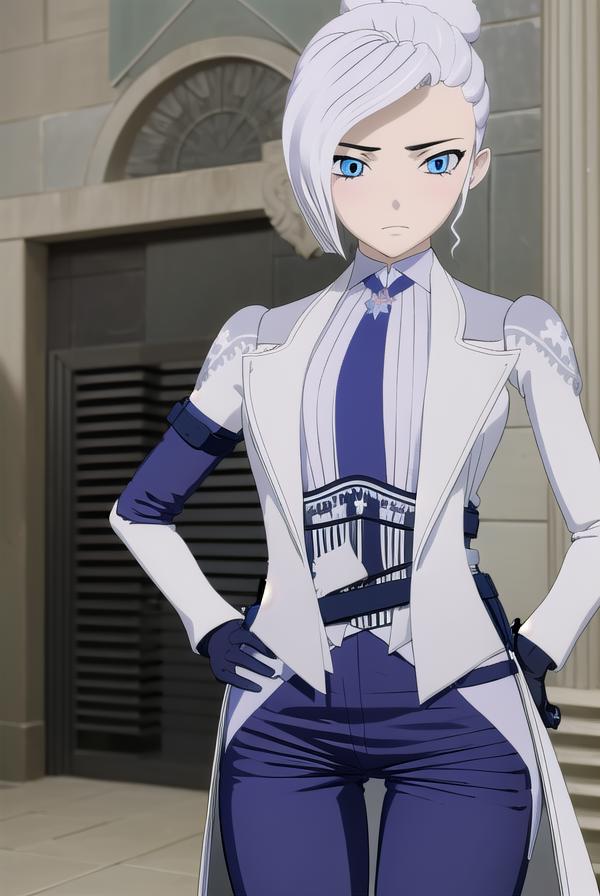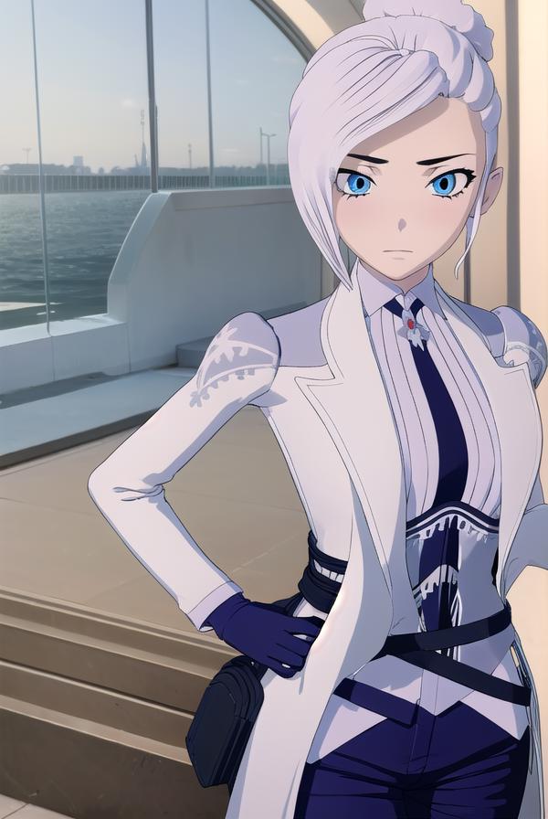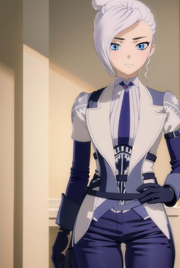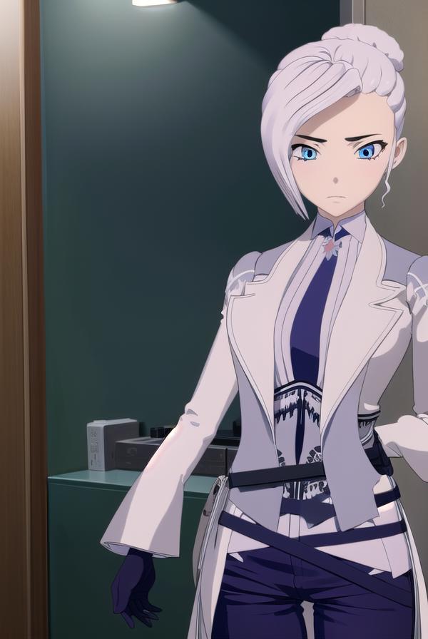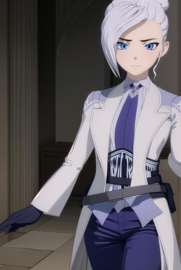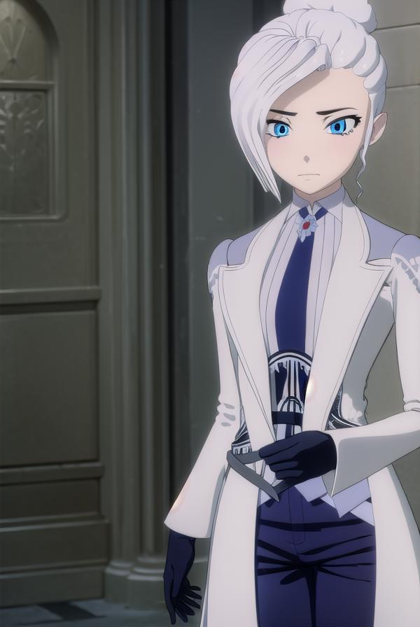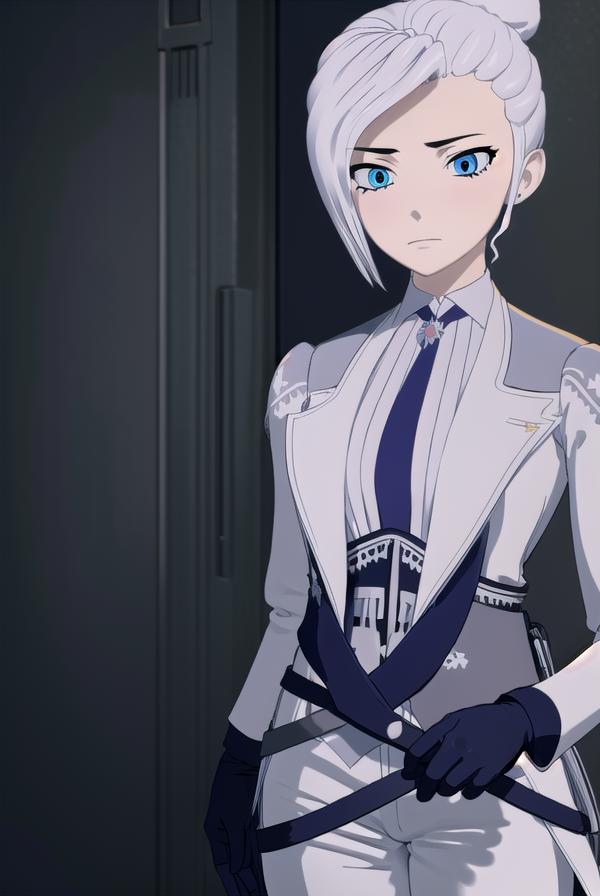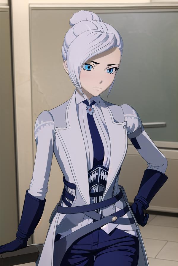 winter schnee, blue eyes, white hair, hair bun, single hair bun,