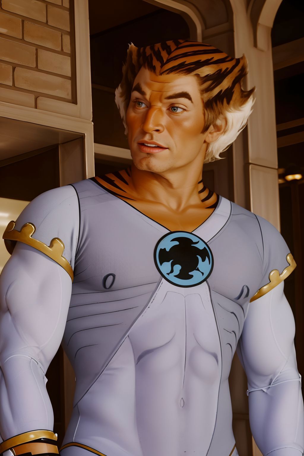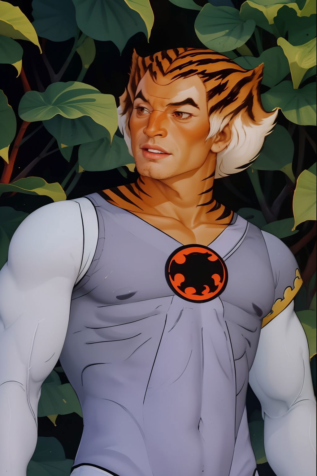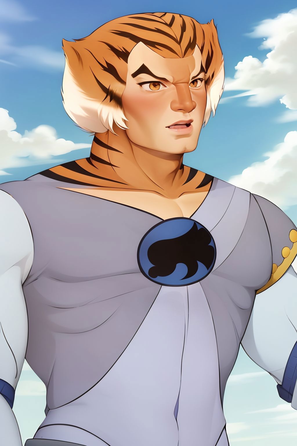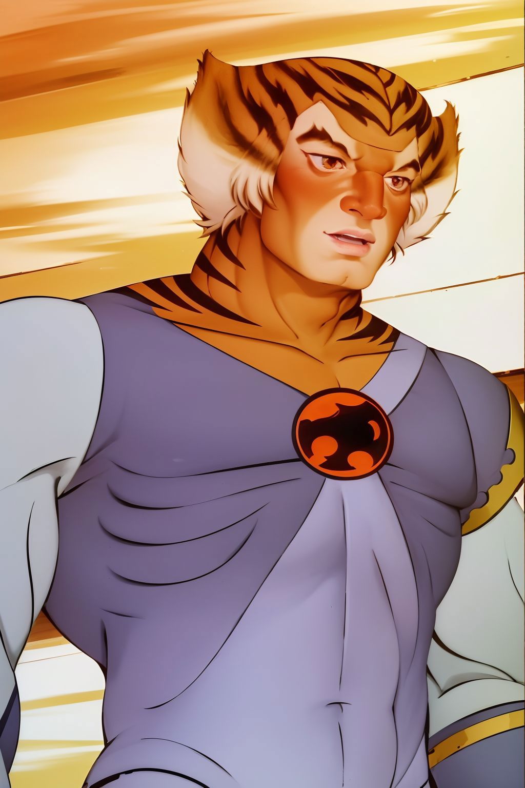tygra, 1boy, two-tone hair, orange eyes, tiger stripes, orange skin, multicolored bodysuit, long sleeves
