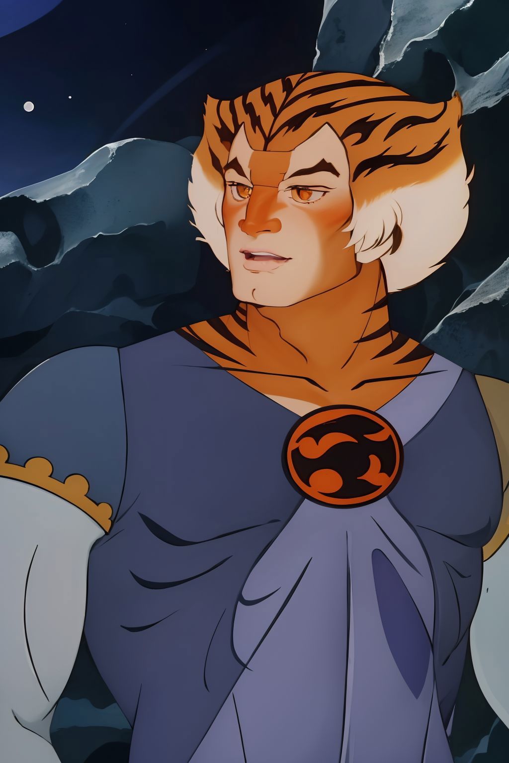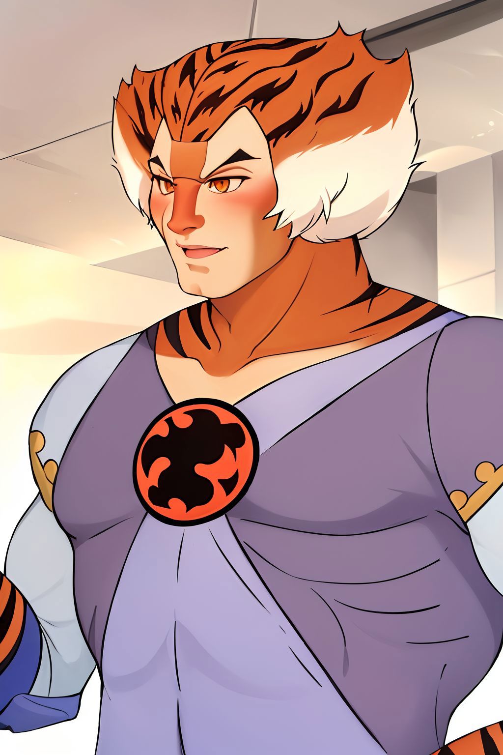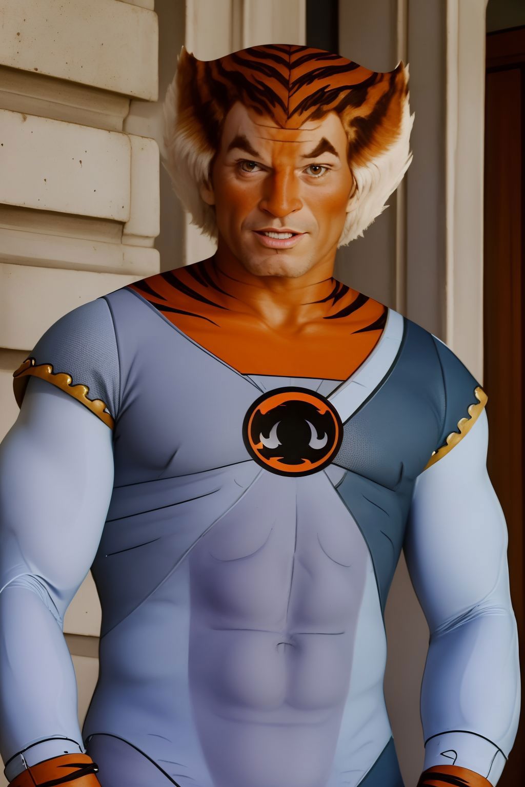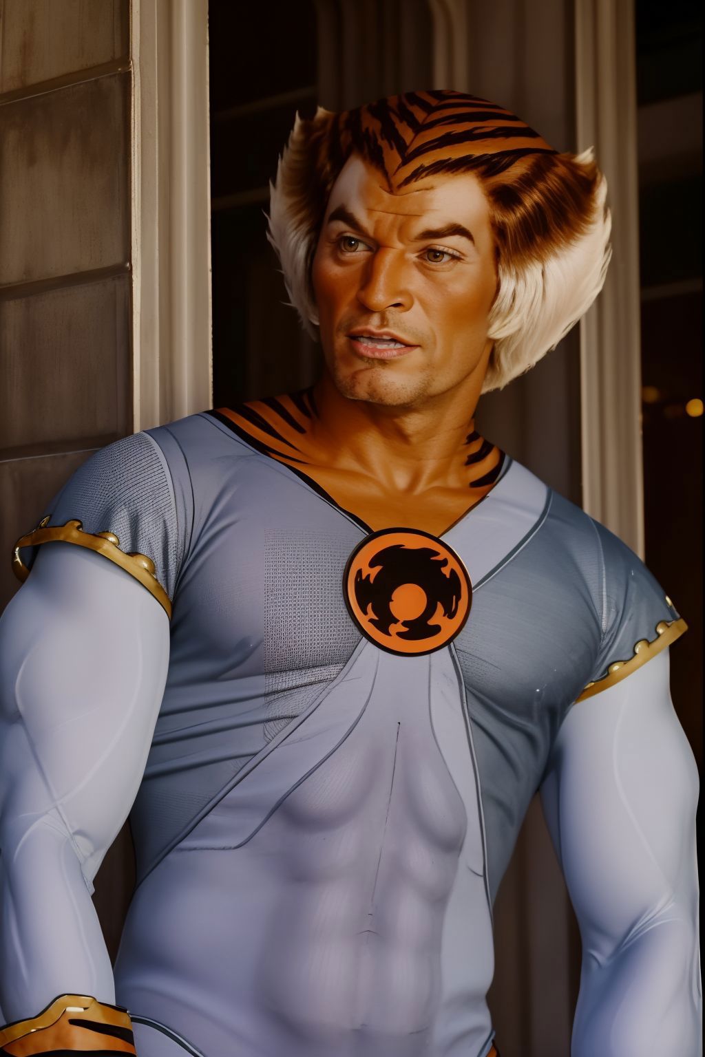 tygra, 1boy, two-tone hair, orange eyes, tiger stripes, orange skin, multicolored bodysuit, long sleeves
