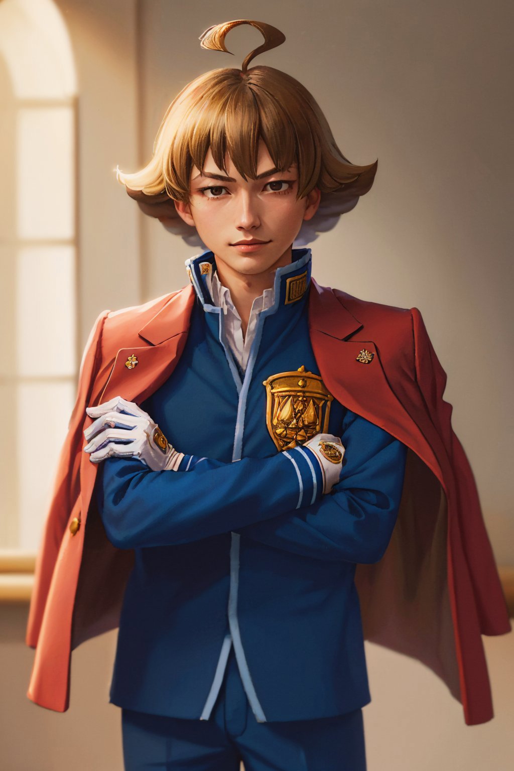 Default Outfit: jacket on shoulders, school uniform, badge, long sleeves, pants, white gloves