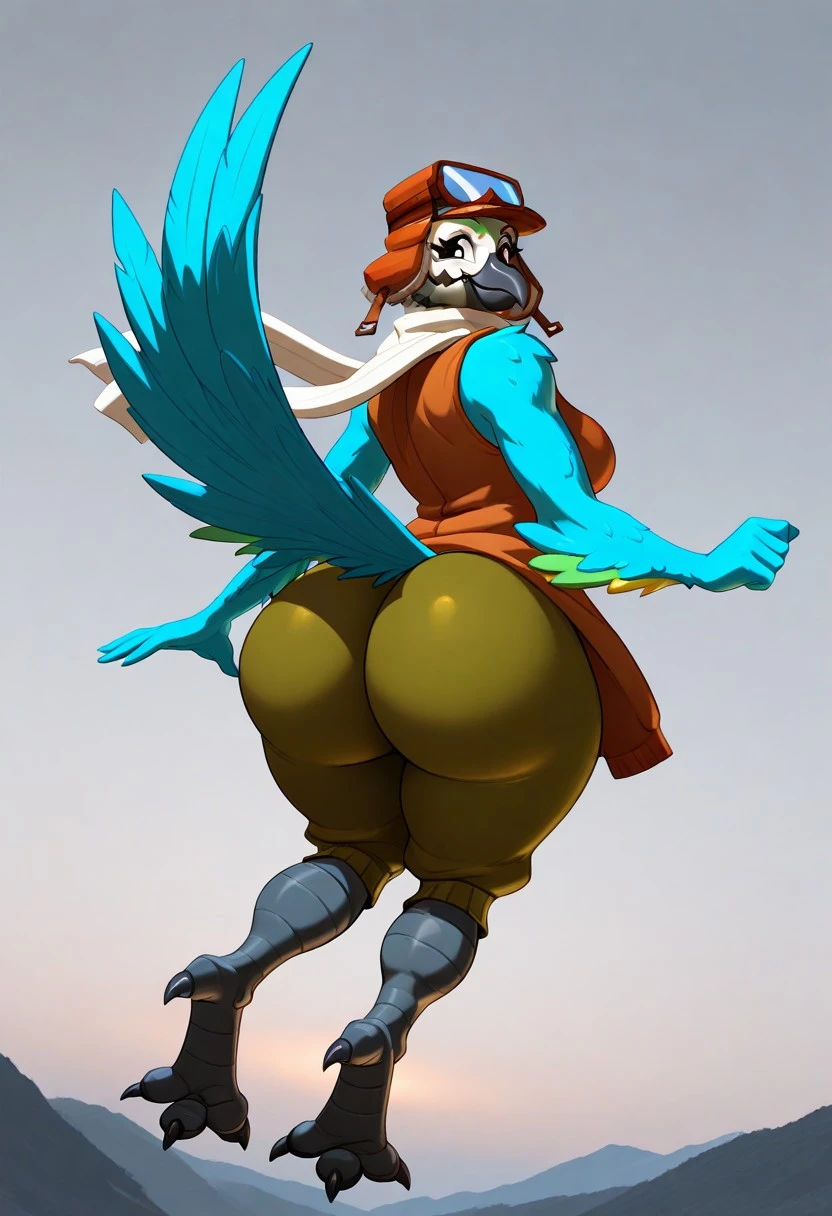 Mollie Macaw, blue fluffy skin, black eyes, dark gray beak, blue wings, blue tail feathers, brown aviator cap, white scarf, sleeveless brown coat, green shorts, dark gray talons