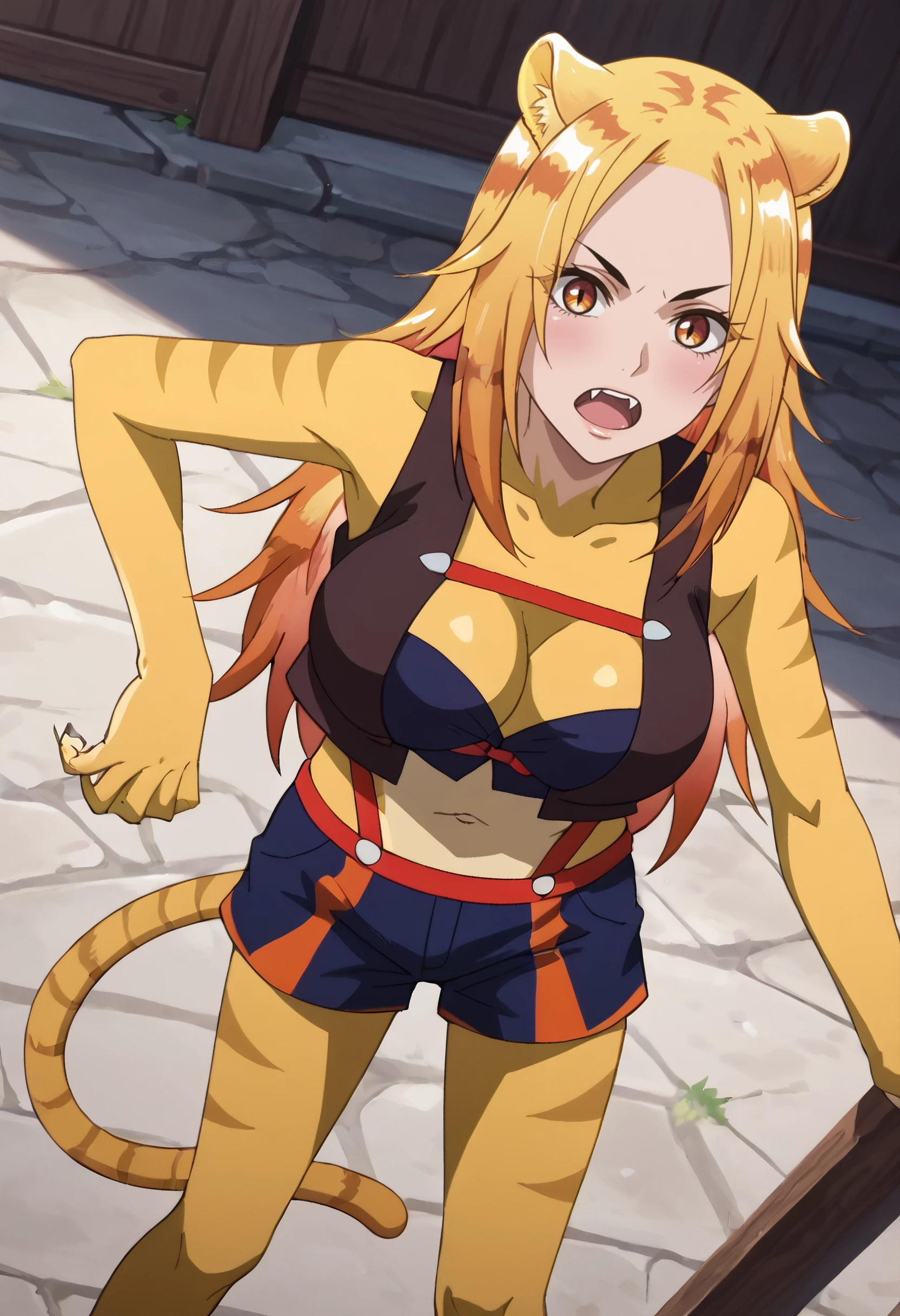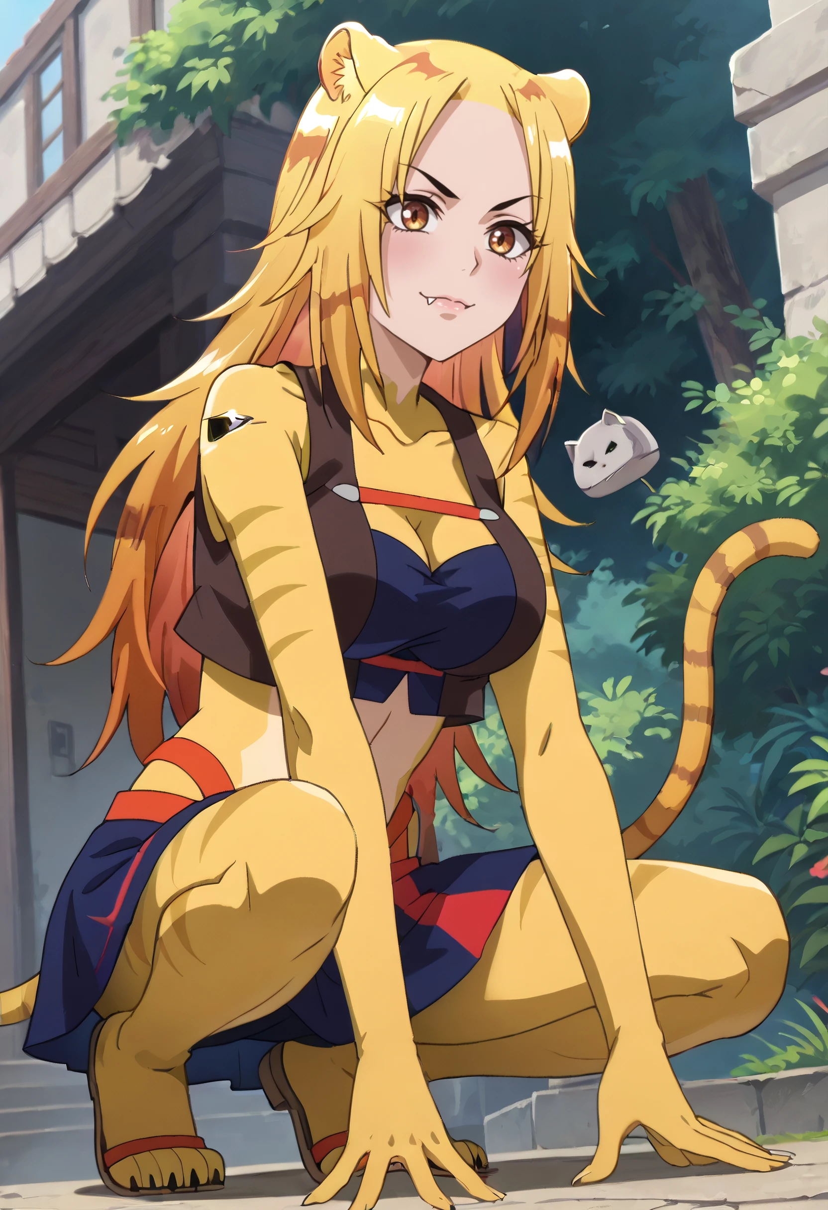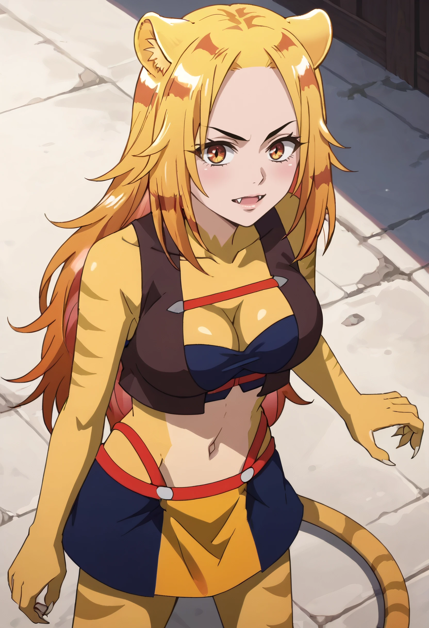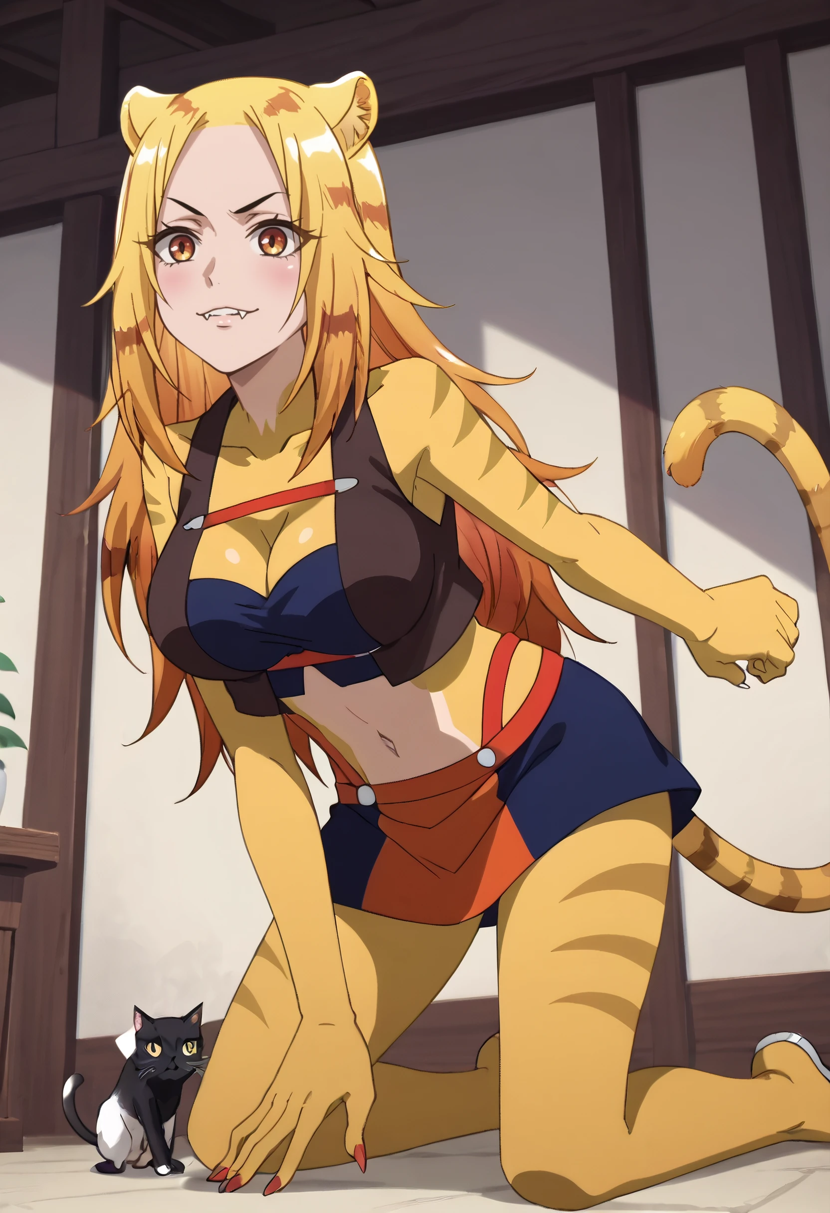 A4ONyamena, blonde hair, long hair, animal ears, brown eyes, tail, multicolored hair, orange hair, cat ears, cat tail, fangs,