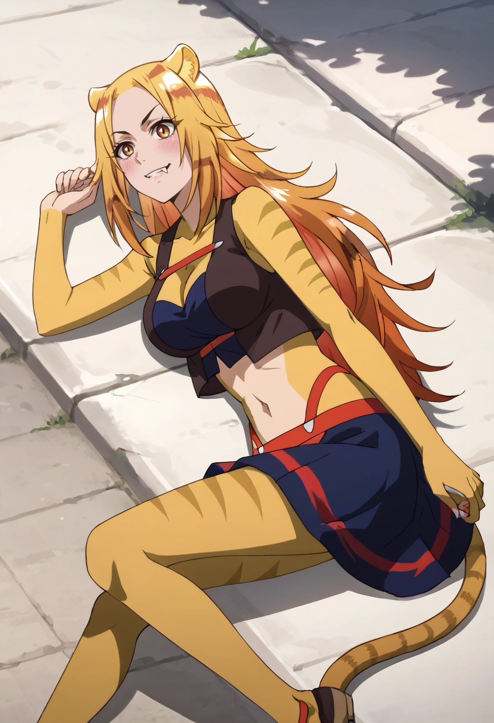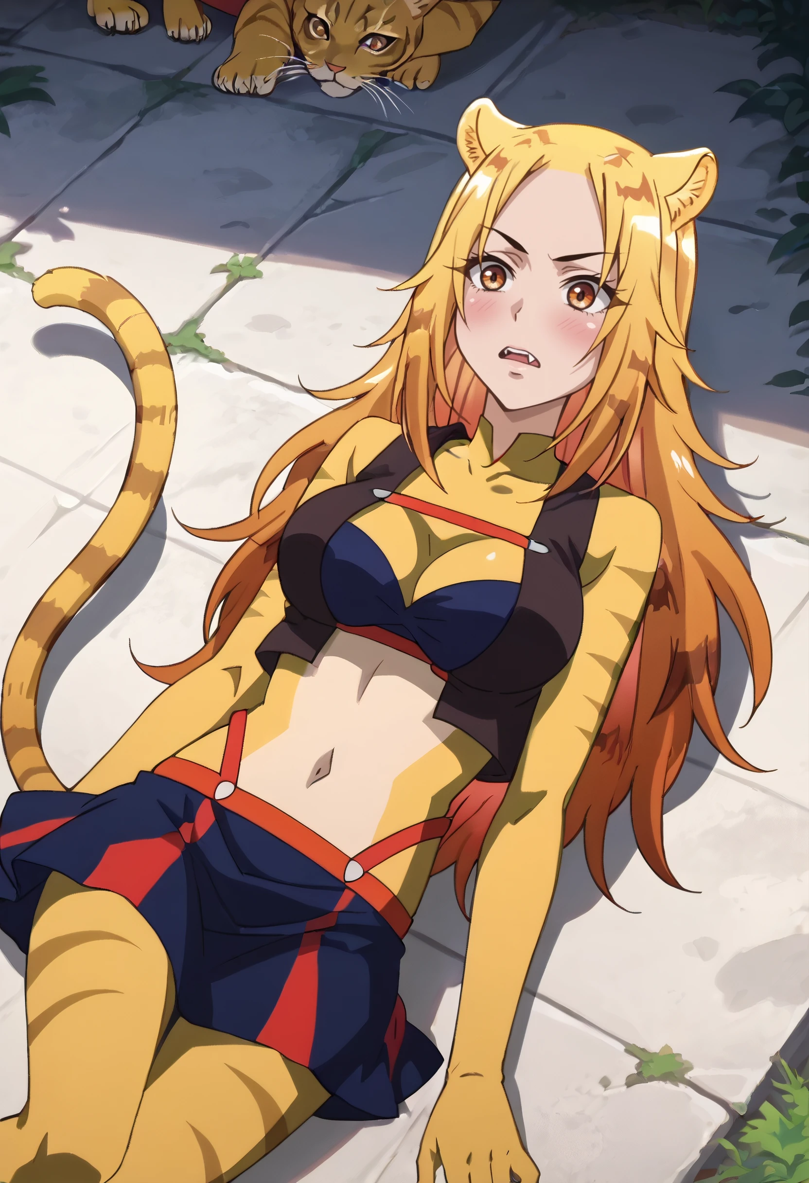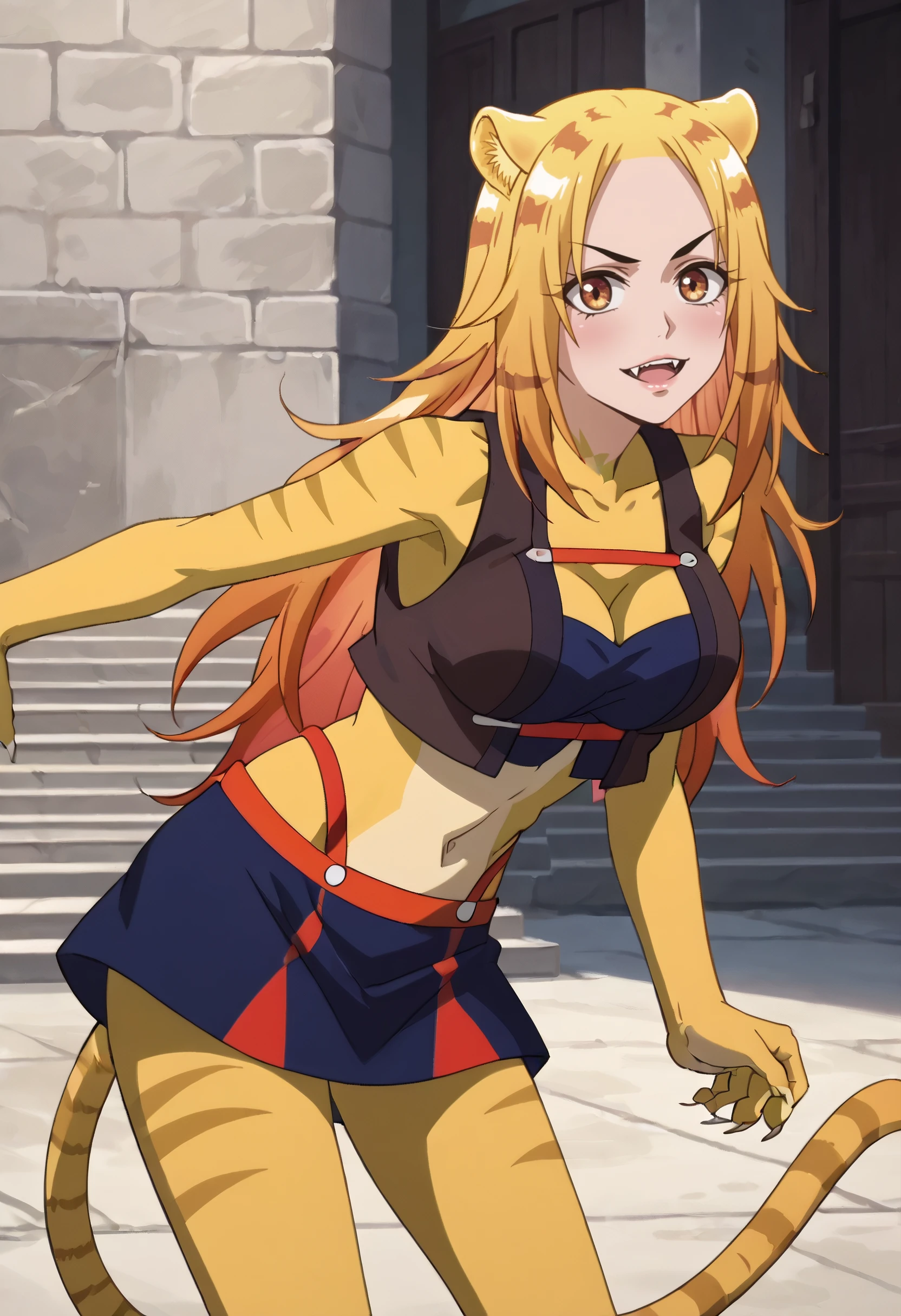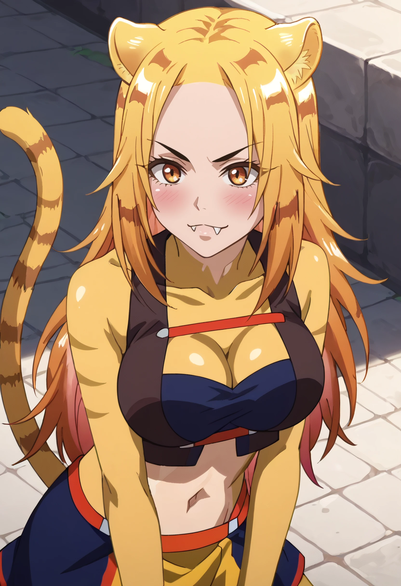 A4ONyamena, blonde hair, long hair, animal ears, brown eyes, tail, multicolored hair, orange hair, cat ears, cat tail, fangs,