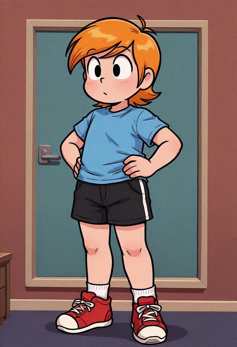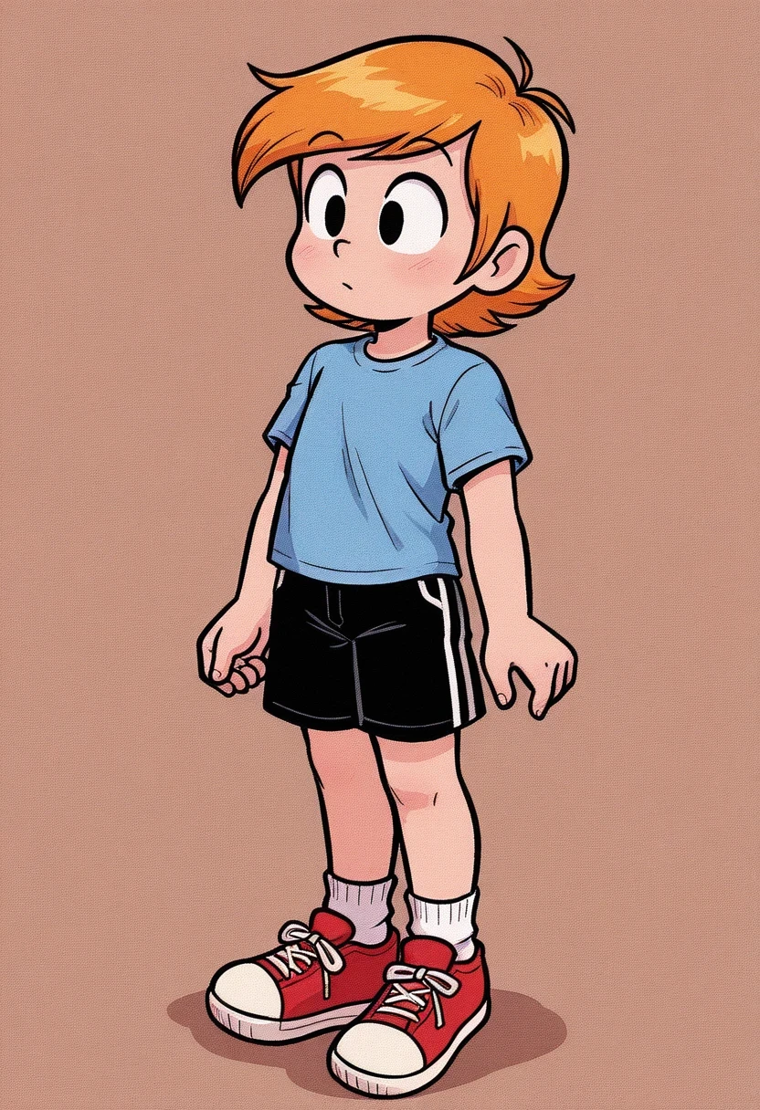 DuduTDM, 1boy, light golden orange hair, blue shirt, black shorts, red shoes, black eyes, short