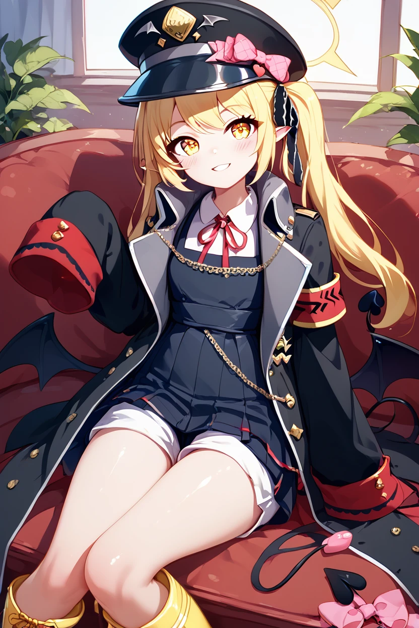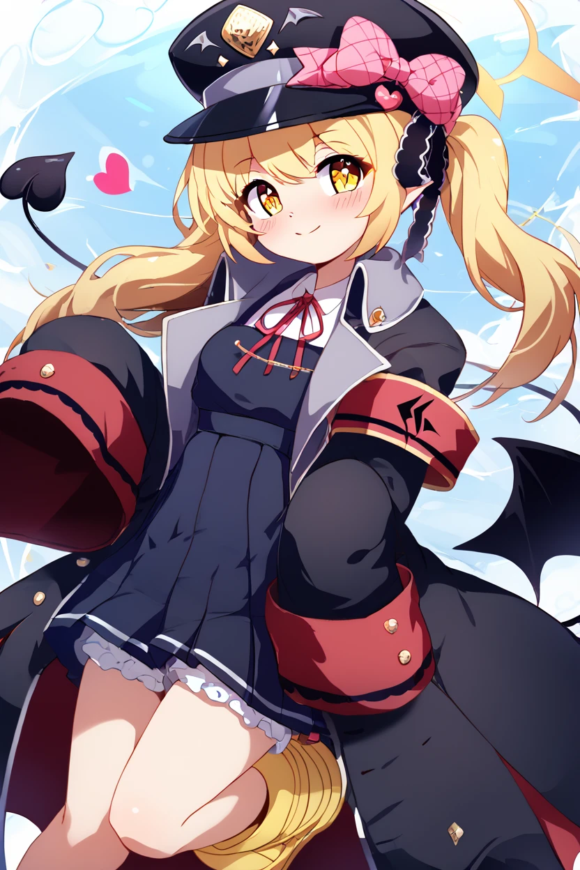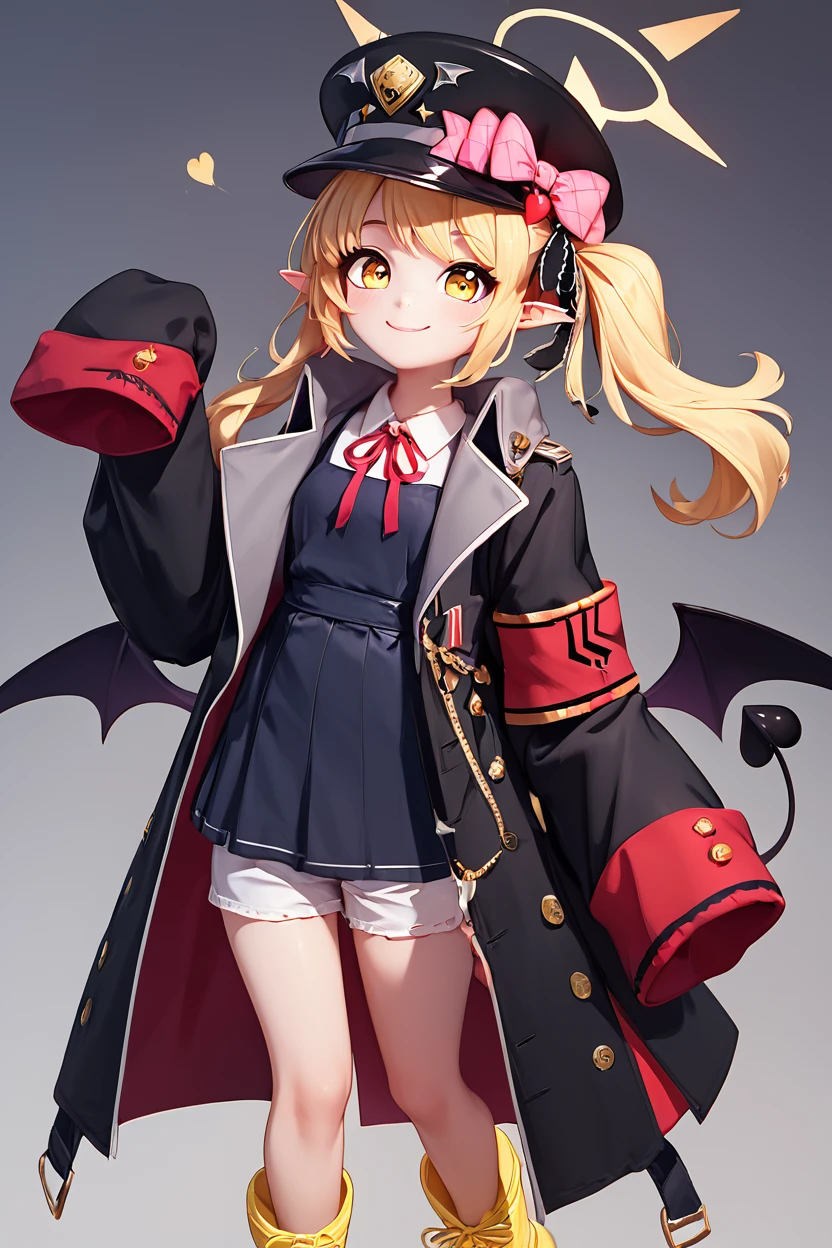 zzIbuki, yellow eyes, yellow halo, blonde hair, long hair, tail, side ponytail, horns, demon horns, black horns, hair ribbon, pointy ears, wings, demon wings, black wings, tail, demon tail, horns, black tail, demon horns, black horns, demon girl, low wings, hair ribbon, neck ribbon, black headwear, red ribbon, peaked cap, black coat, collared shirt, long sleeves, open coat, pinafore dress, sleeves past fingers, black dress, hat bow, white shirt, yellow footwear, boots, white bloomers, oversized clothes, red armband, military hat, pink bow,