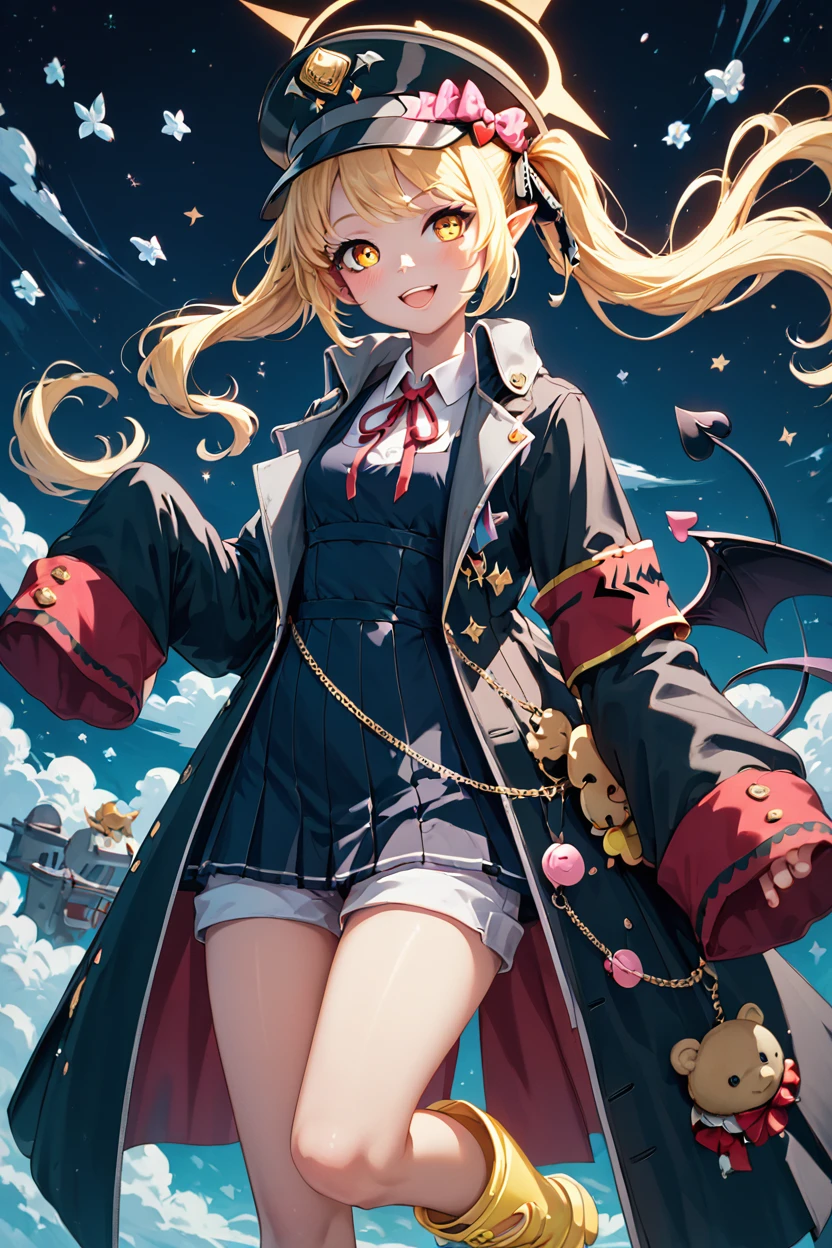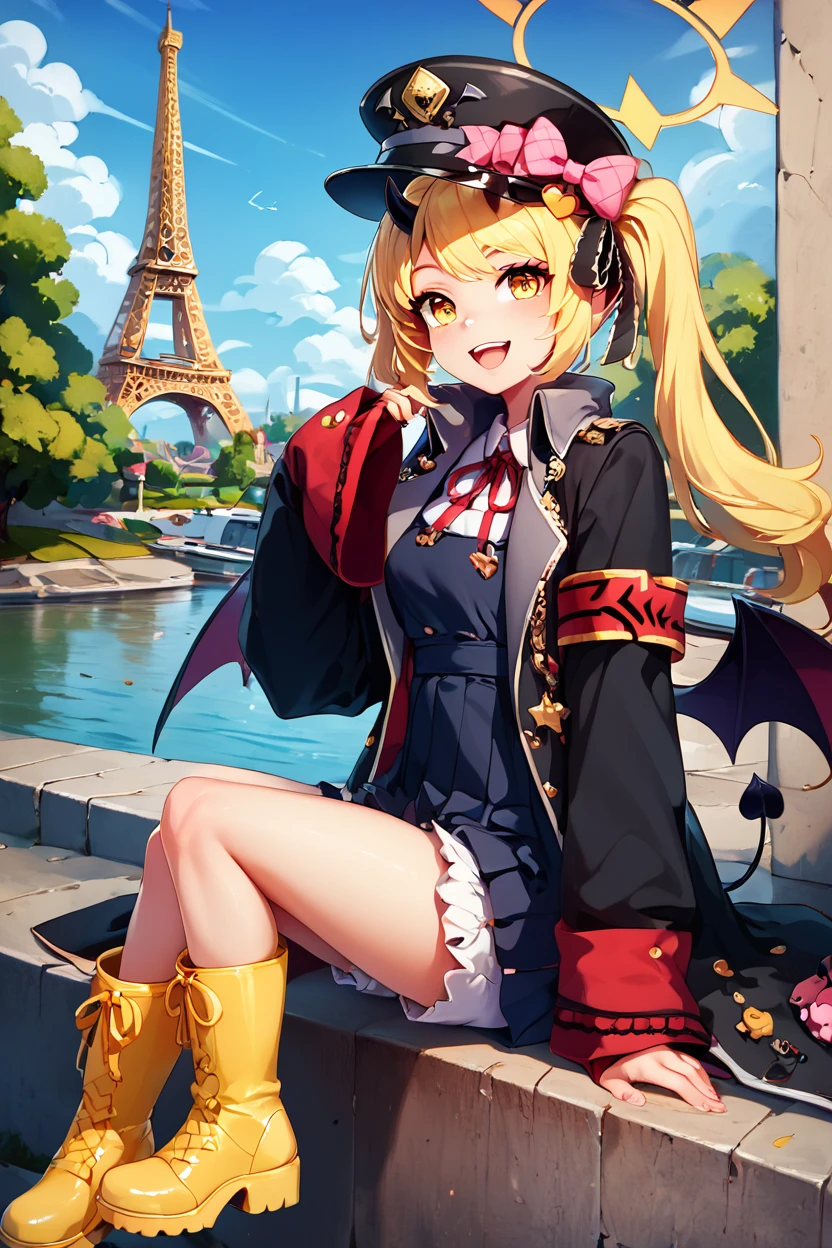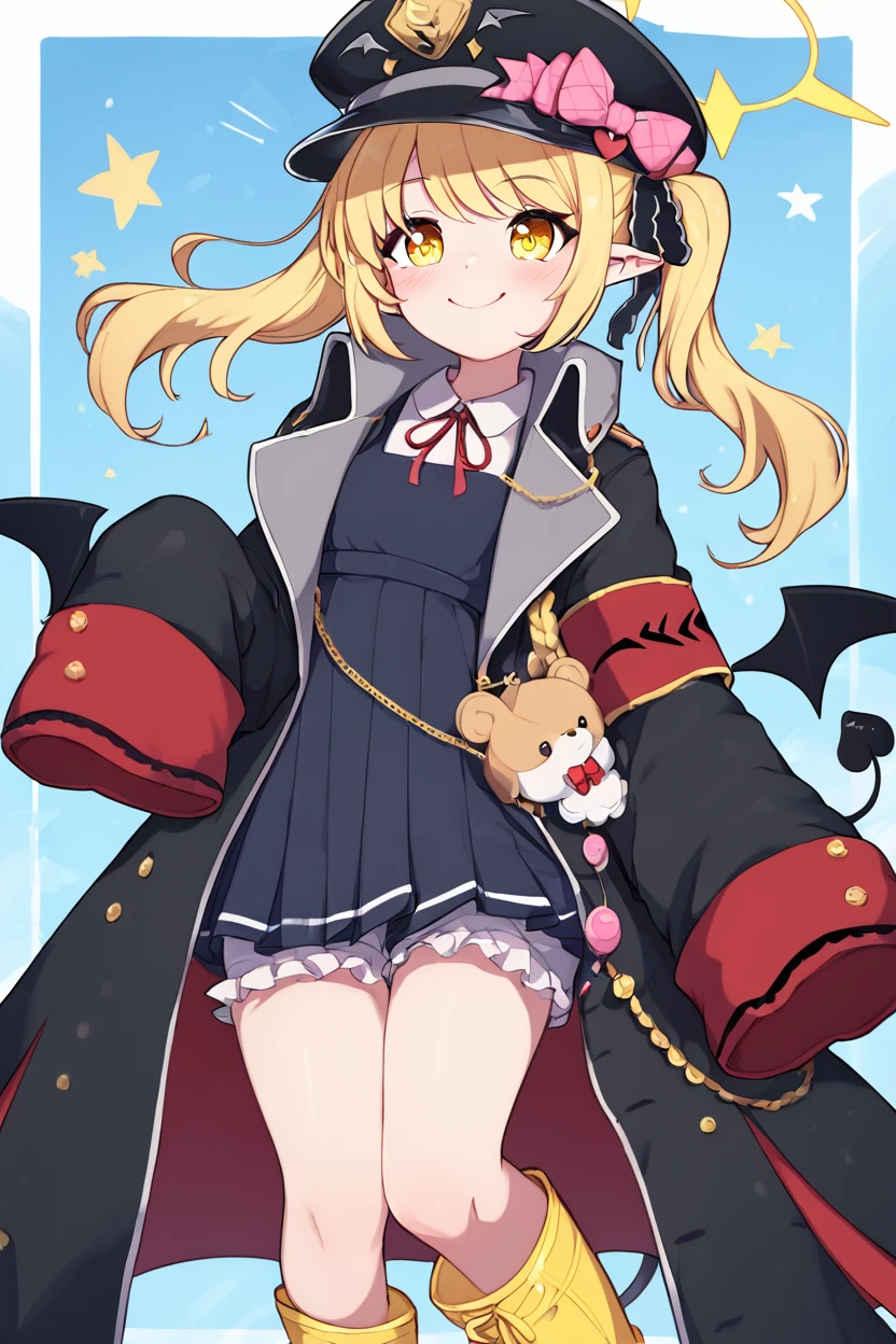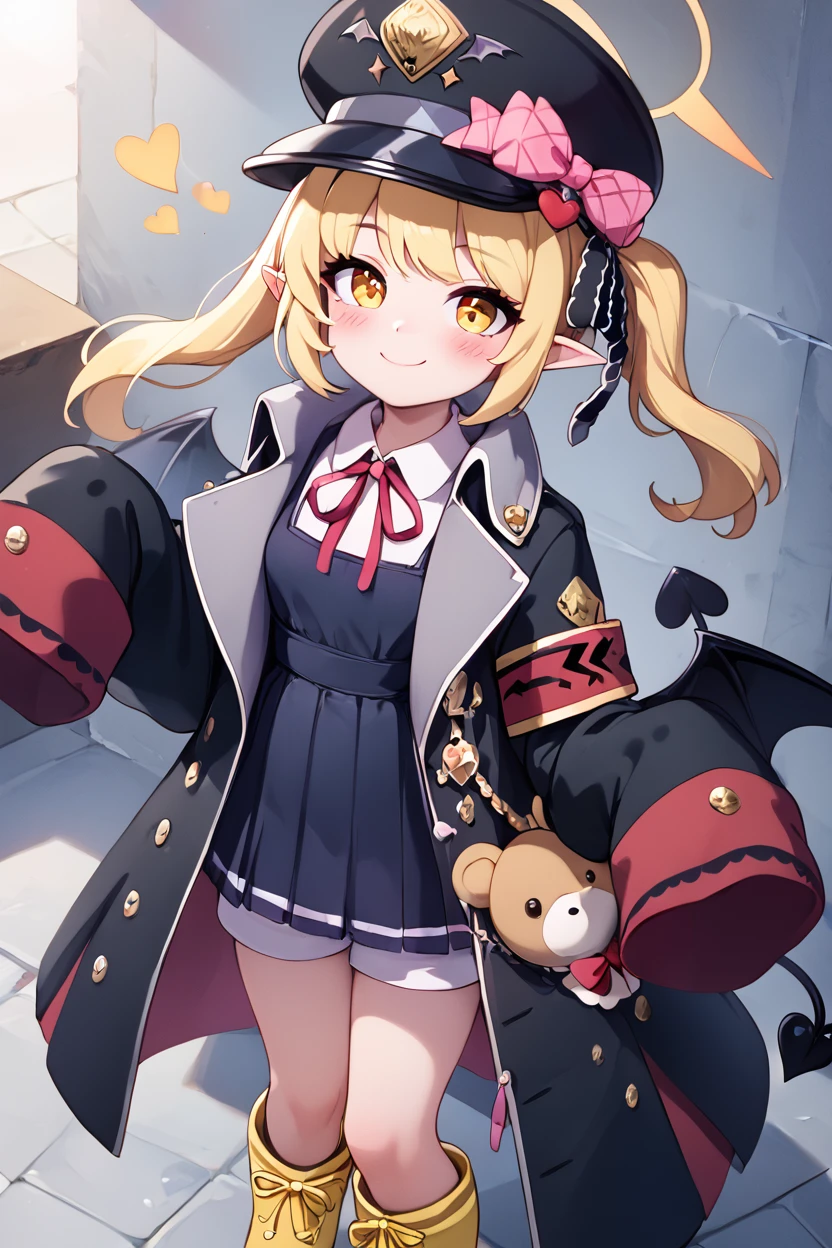 zzIbuki, yellow eyes, yellow halo, blonde hair, long hair, tail, side ponytail, horns, demon horns, black horns, hair ribbon, pointy ears, wings, demon wings, black wings, tail, demon tail, horns, black tail, demon horns, black horns, demon girl, low wings, hair ribbon, neck ribbon, black headwear, red ribbon, peaked cap, black coat, collared shirt, long sleeves, open coat, pinafore dress, sleeves past fingers, black dress, hat bow, white shirt, yellow footwear, boots, white bloomers, oversized clothes, red armband, military hat, pink bow,