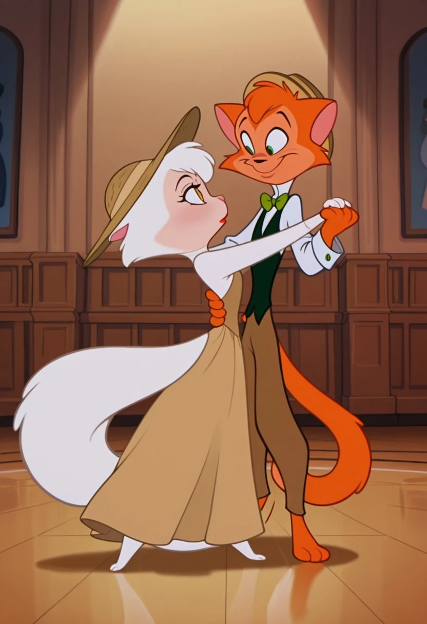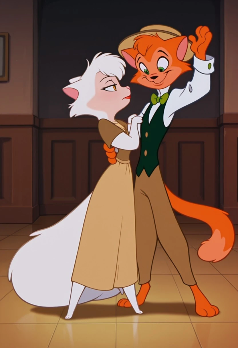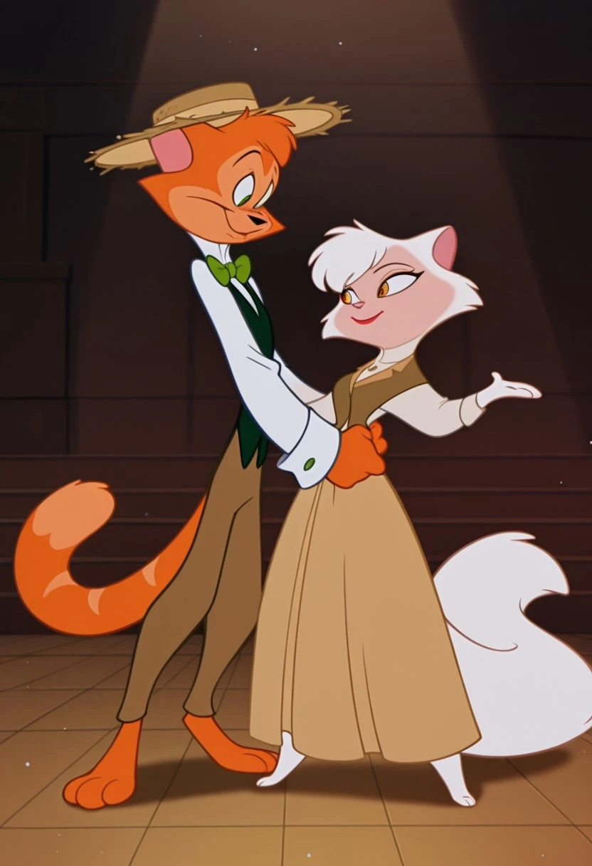 ZZDanny, male, Tall, slender, orange tabby cat, green eyes, white shirt, brown trousers, green bow tie, black vest, straw boater hat, cartoon, 2D, screencap