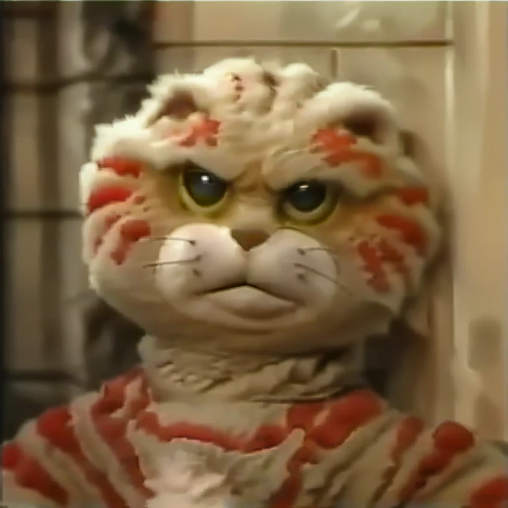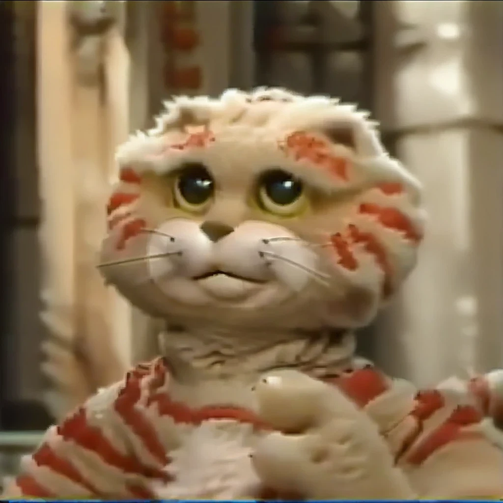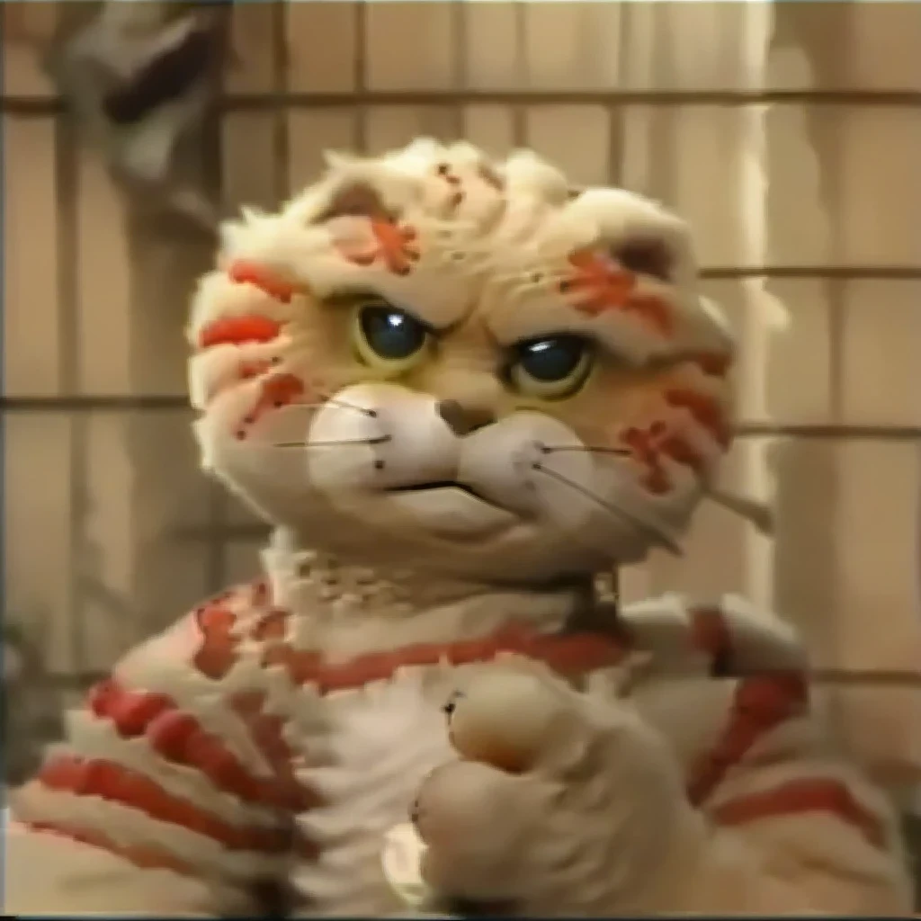 ricky_pelc, cat, puppet, orange fur, yellow sclera, black eyes, upper body, whiskers