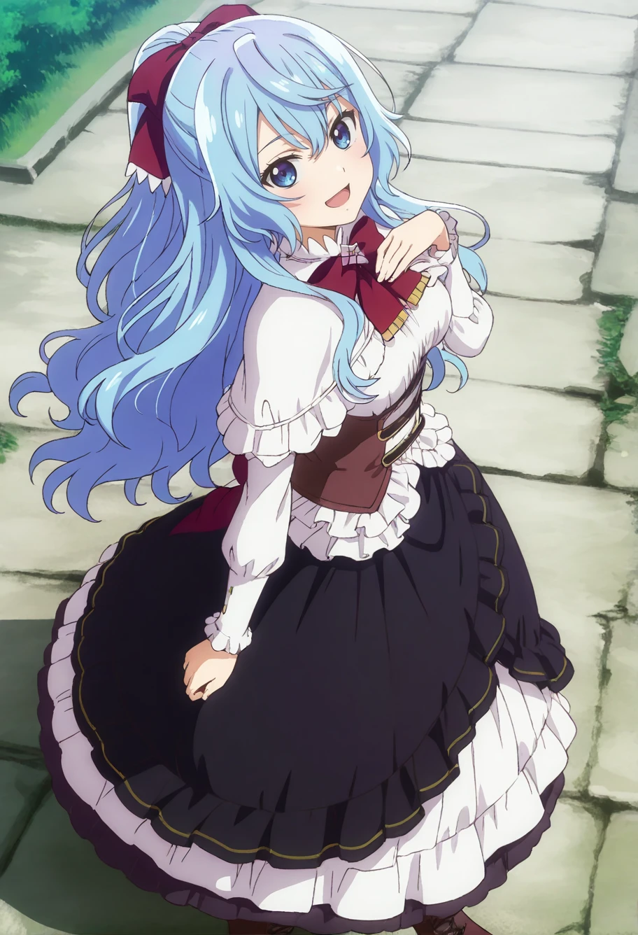 liselotte-default,blue eyes,blue hair,long hair,hair ribbon,frilled dress,puffy long sleeves,white caplet,red bow,corset, black skirt,long skirt,lace-up boots