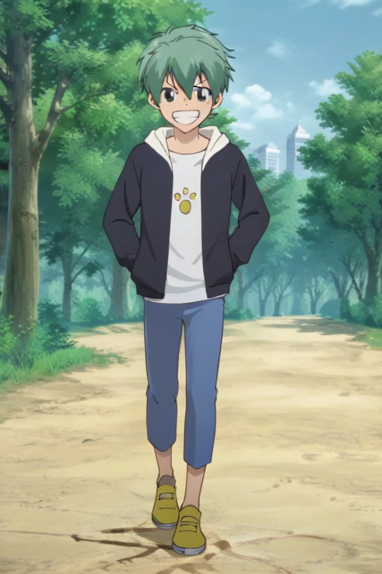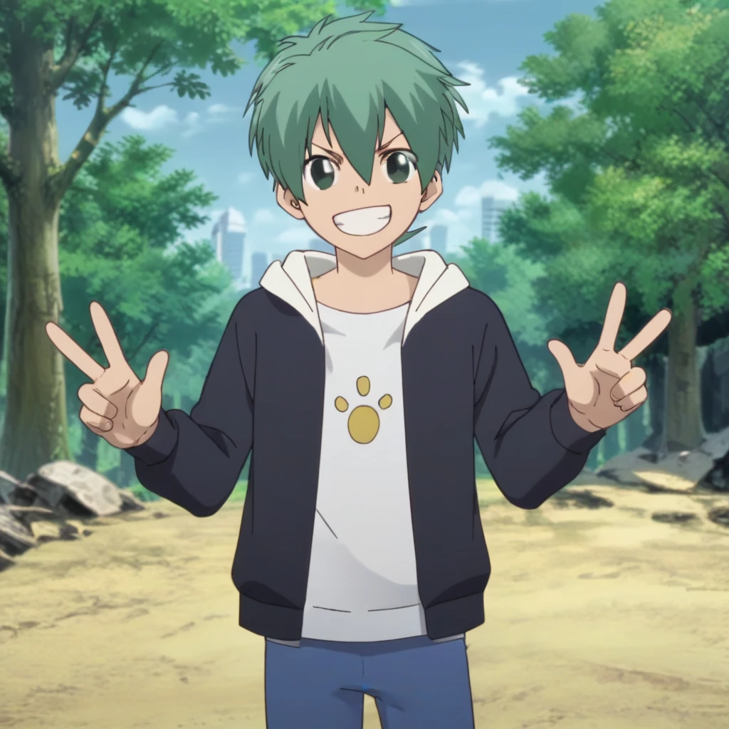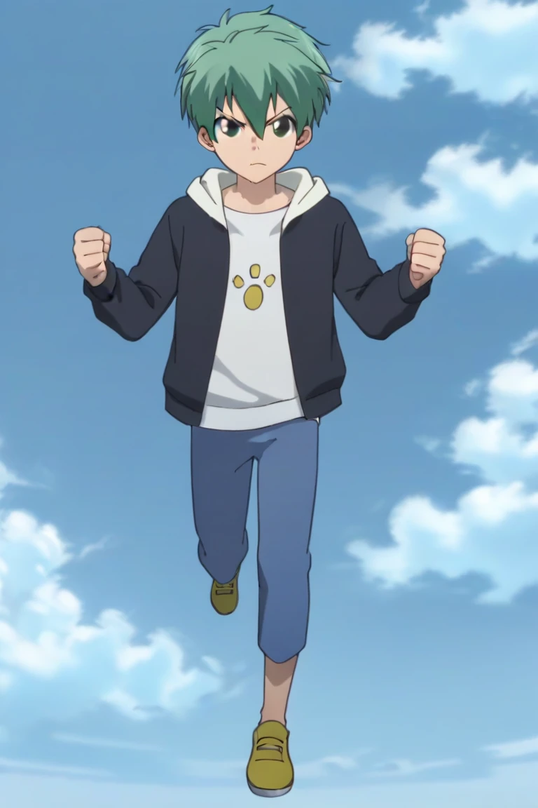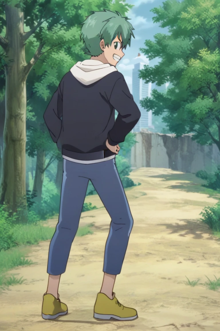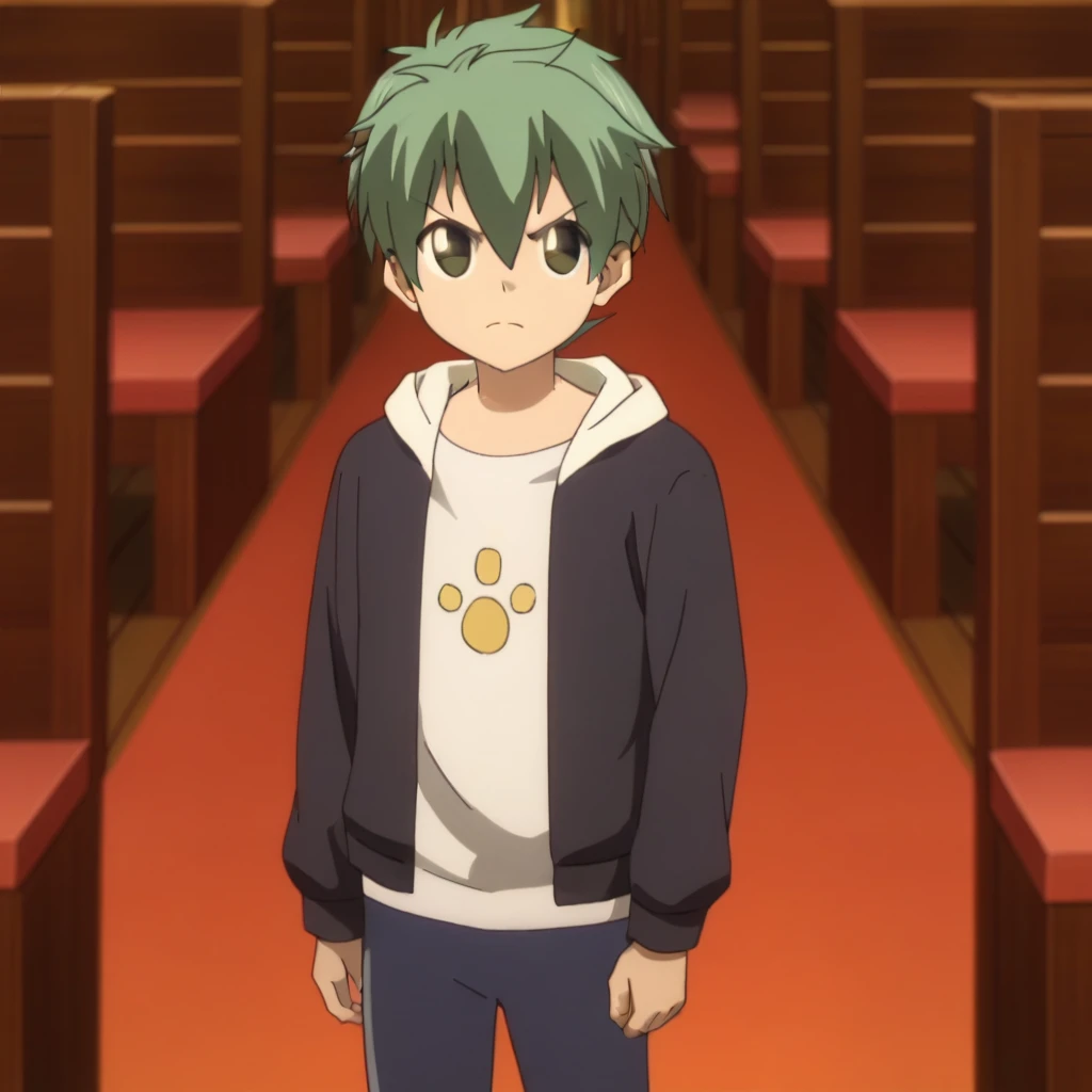 Prompts: male, green hair, dark green eyes, black jacket, white hood, grey t-shirt, grey print shirt, blue pants, yellow shoes, indoors (throne room/church), outdoors (city/nature/rubble)