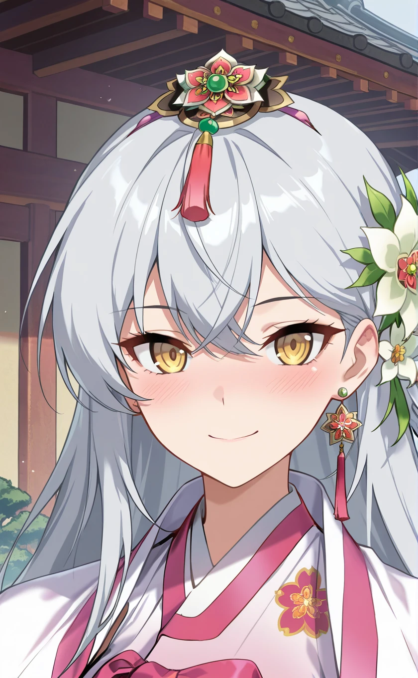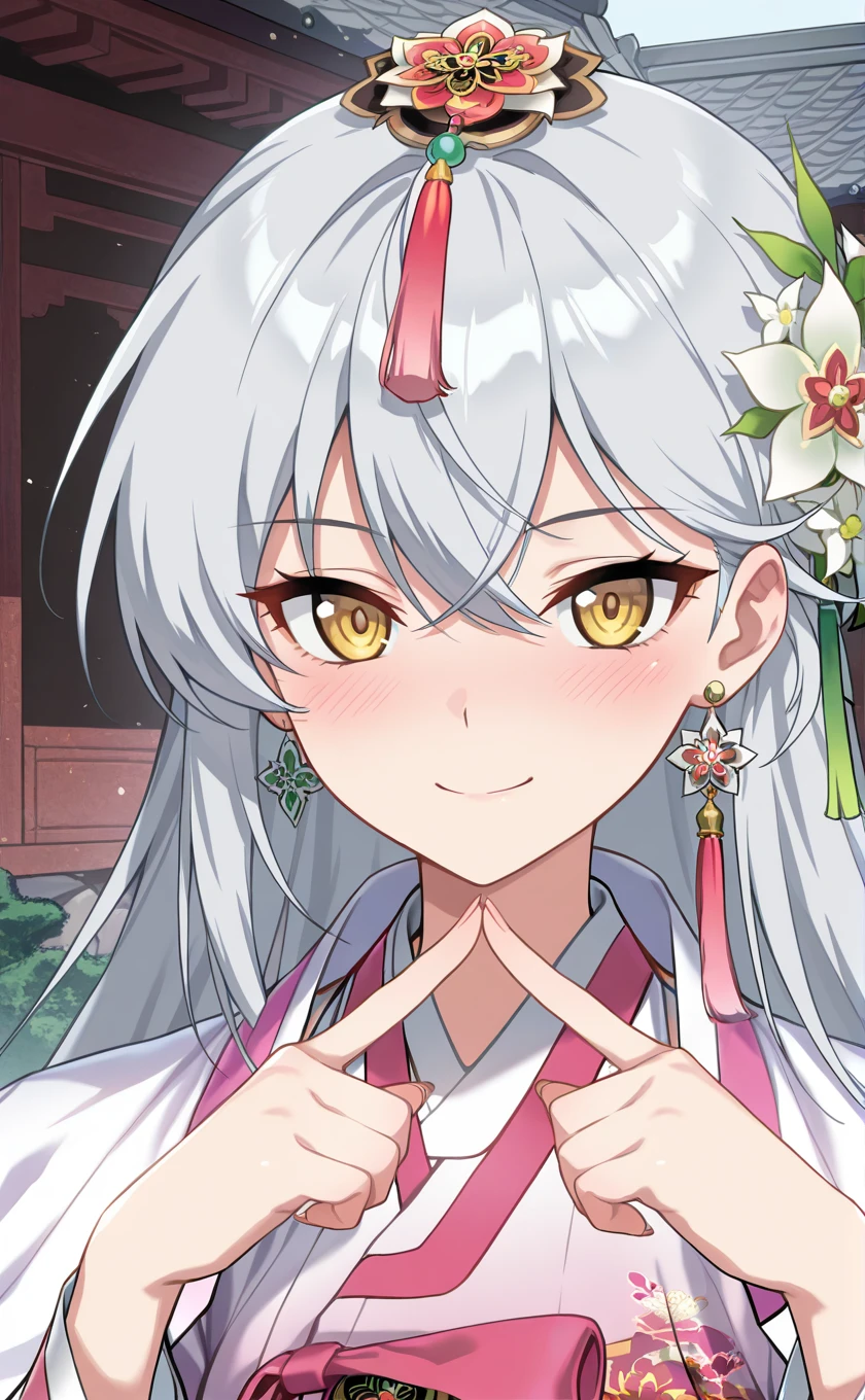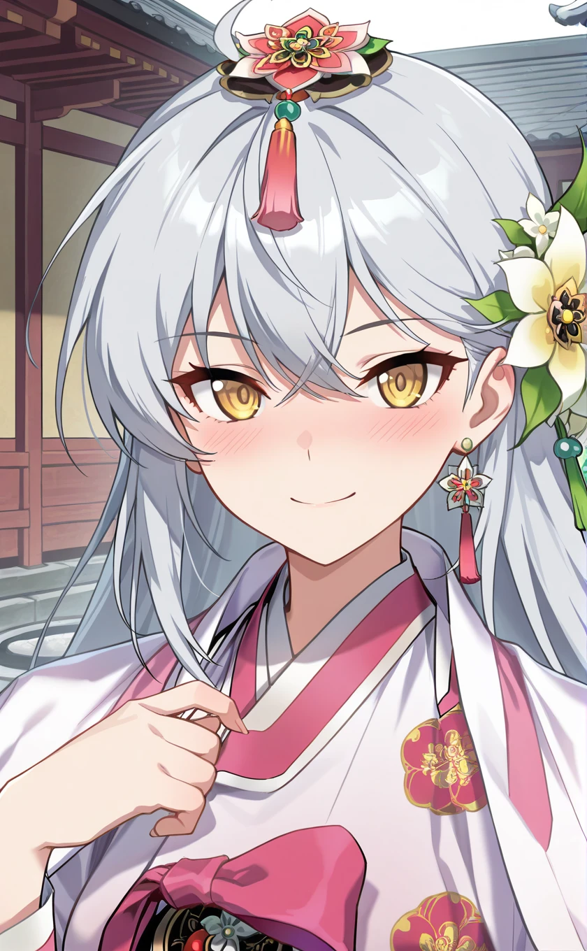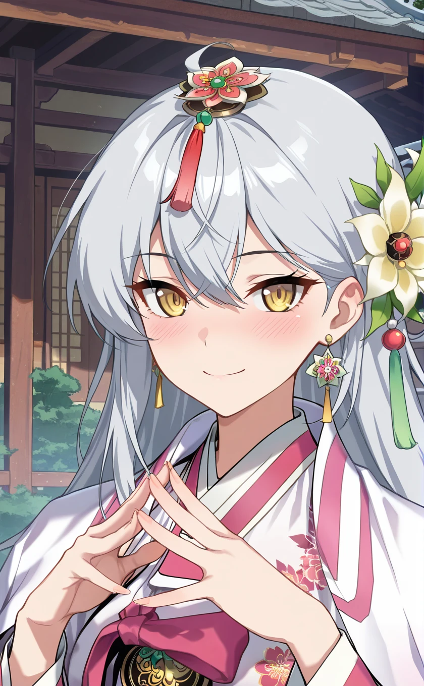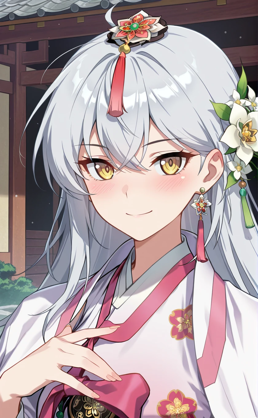grey hair,very long hair,hair ornament,hair flower,white flower,earrings,hair between eyes,yellow eyes