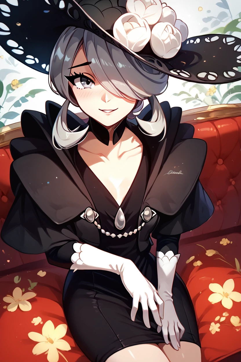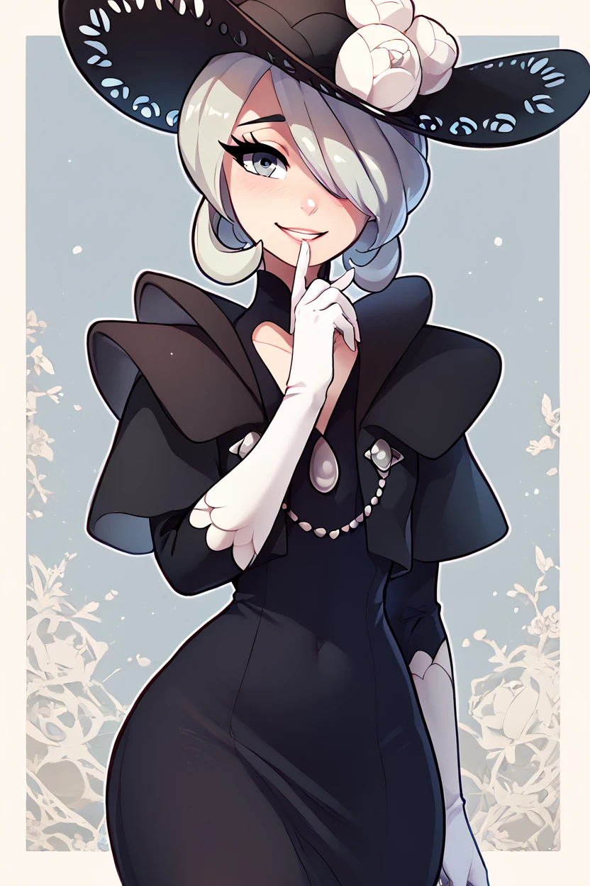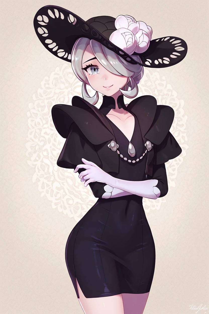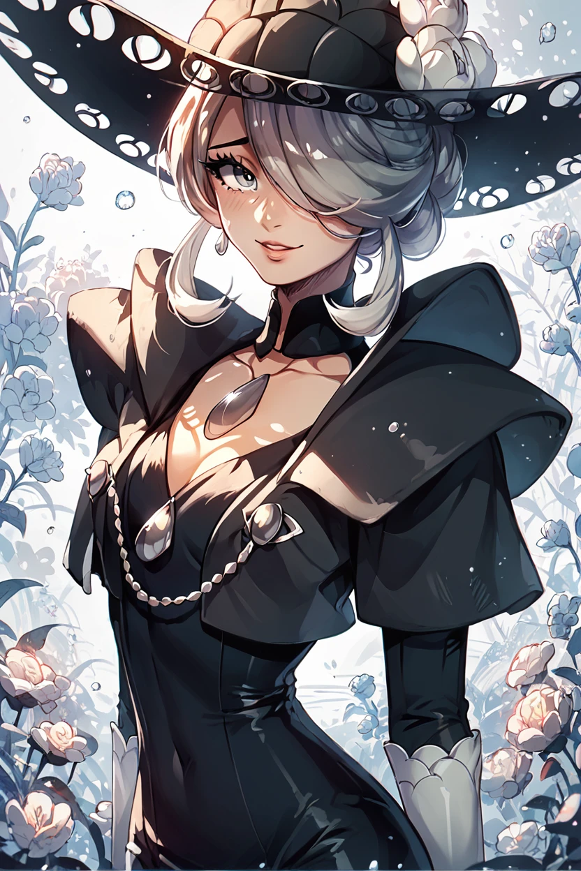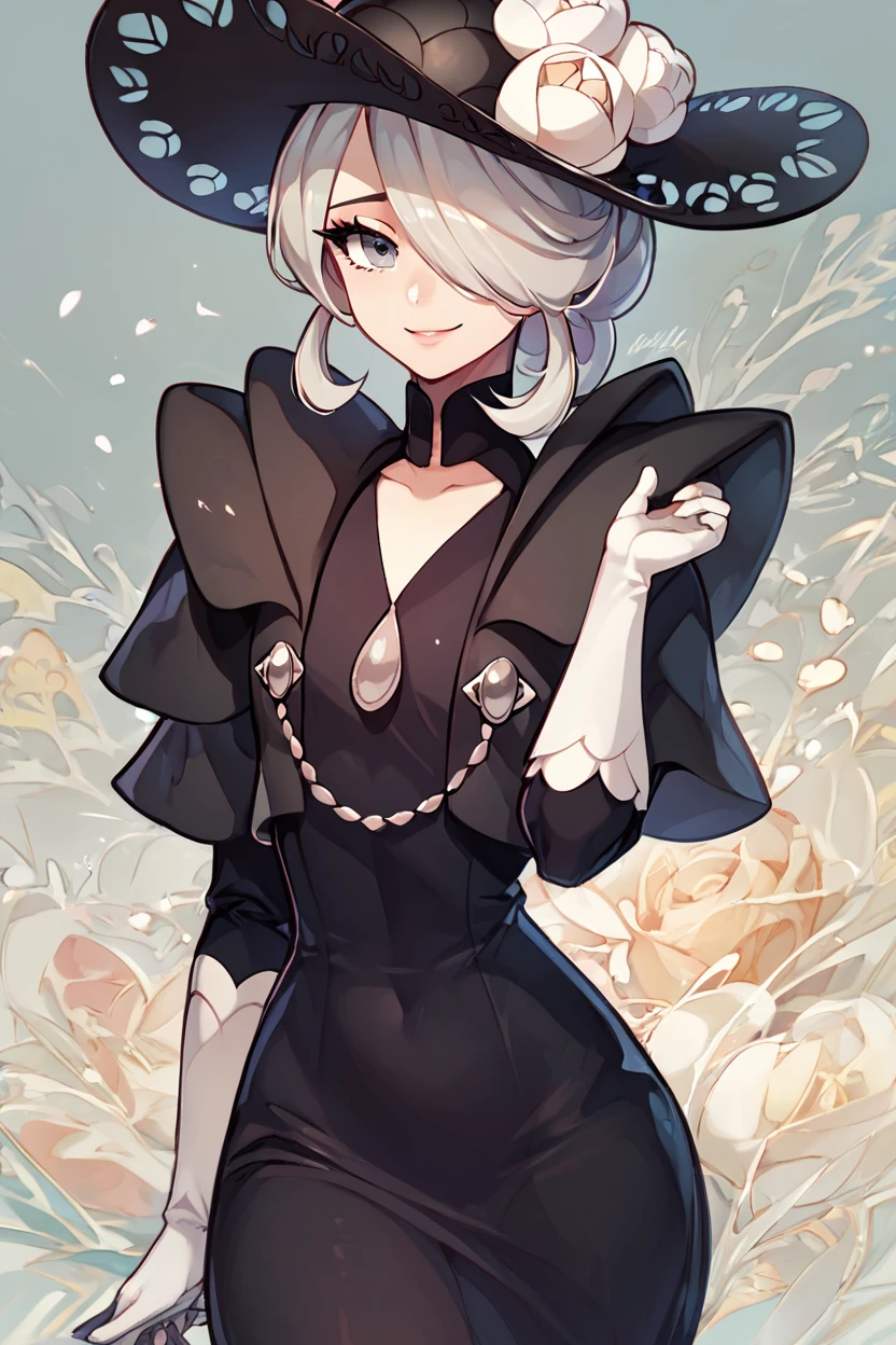 zzCogita, hair over one eye, grey hair, white hair, short hair, grey eyes, black hat, black dress,
