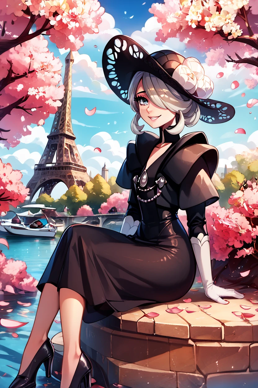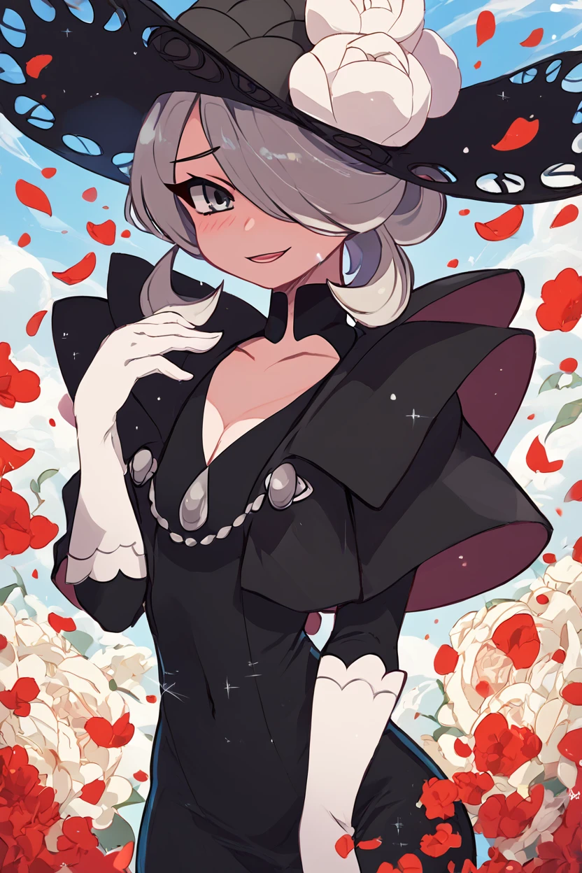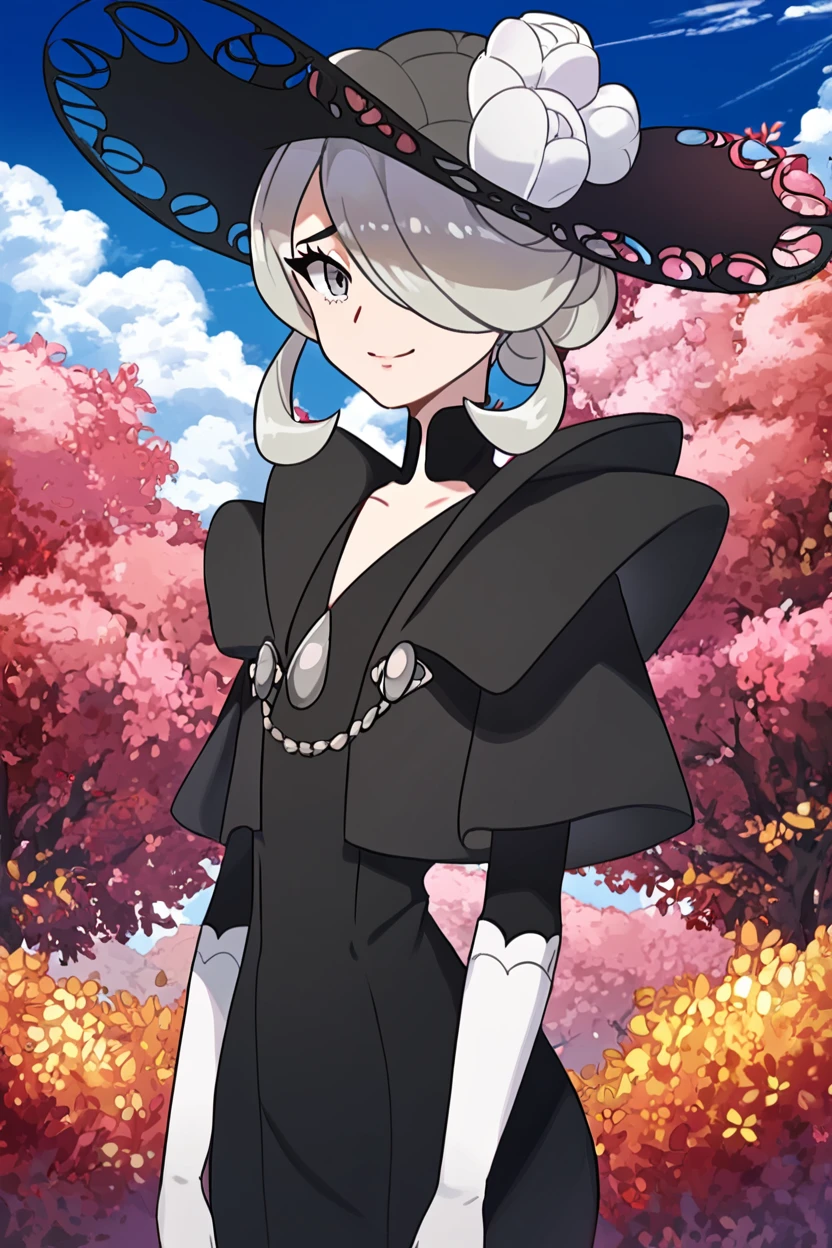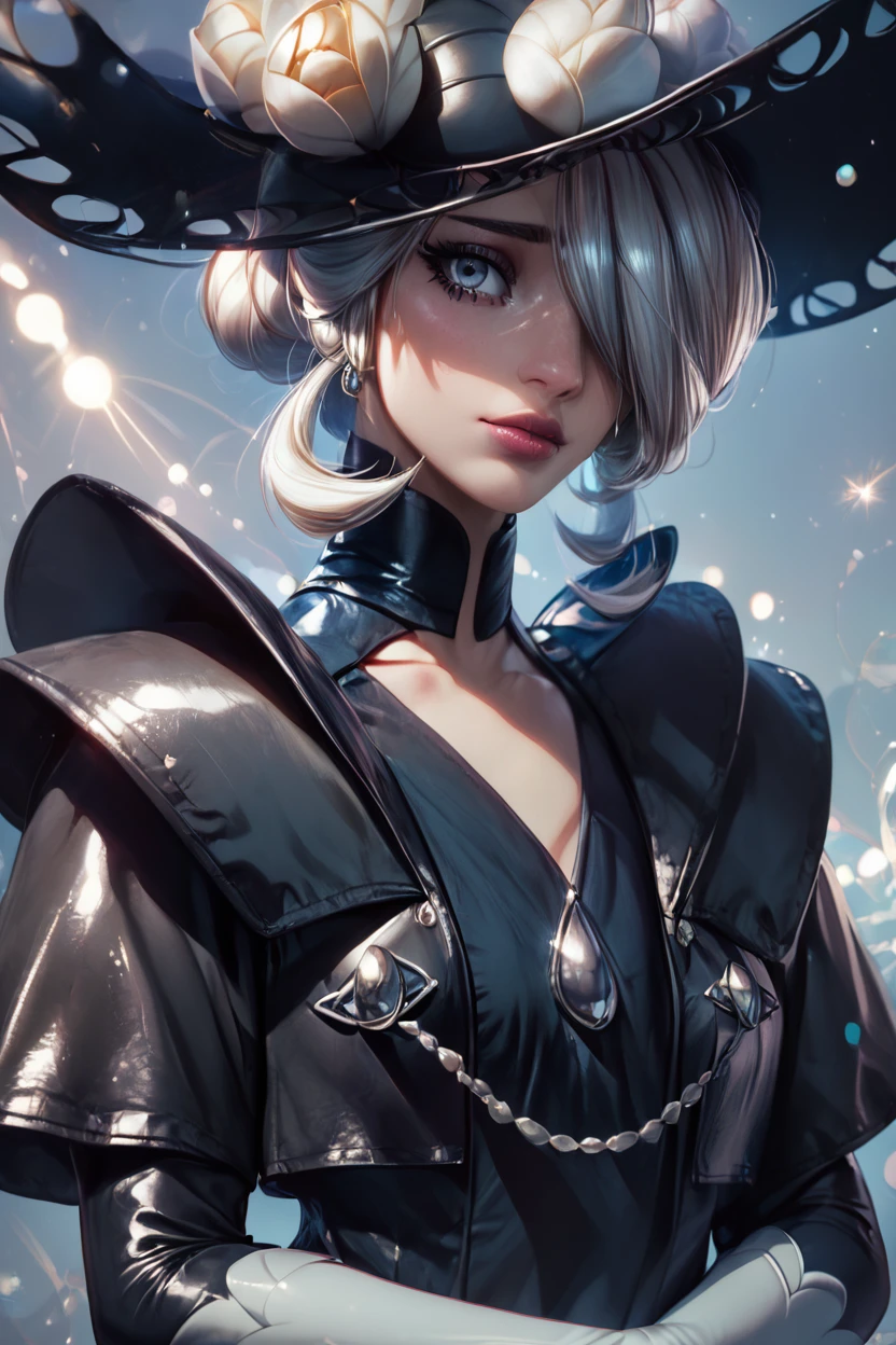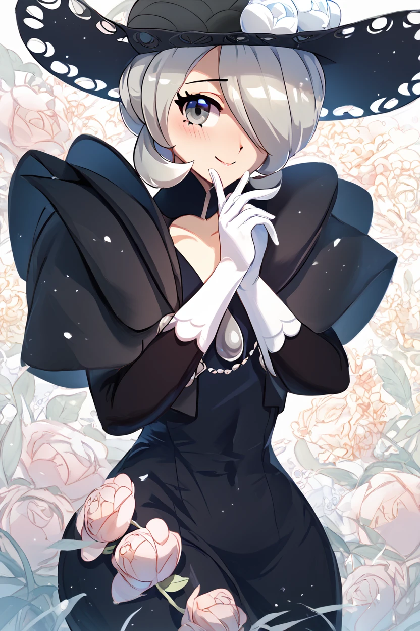 zzCogita, hair over one eye, grey hair, white hair, short hair, grey eyes, black hat, black dress,