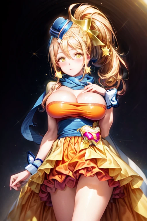 Trigger word: etoile_a, long hair, yellow hair, high ponytail, perm ponytail, yellow eyes, big breasts, jewelry, star (symbol), mini hat, blue headwear, magical girl, scarf, orange dress, wrist cuffs, orange high heels,